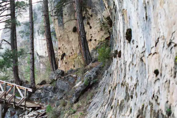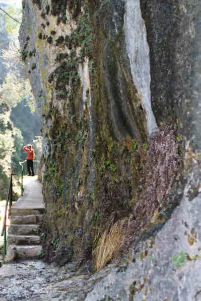 Pinguicula dertosensis growing on the high calcareous cliff. Note the wooden bridge for this touristic tour… Photo : Eric Partrat Track this image in its original page : link
