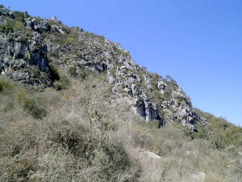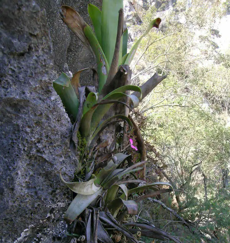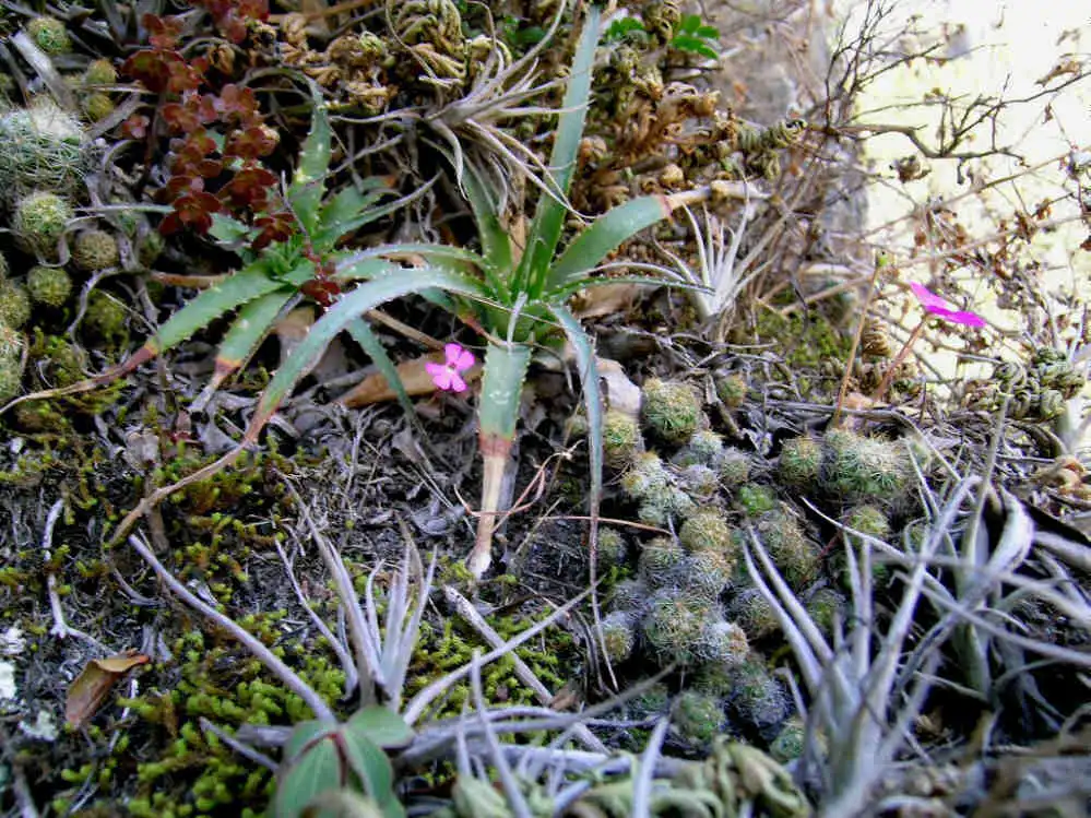 So with high hopes, I drove along dirt roads in very dry hilly terrain, with barely any vegetation at all. A turn in the road brought me around a mountain and opened up a view of a very deep valley. The road zigzagged down into the valley to a touristy spot with caves and thermal baths which are what make the area famous. But I was more interested in some calcareous cliffs near the road…. Right off I spotted on the cliffs Vriesia-like bromeliads, a strange sight in such a dry area. I whipped out my GPS and sure enough the cliff was N-facing. This place was almost EXACTLY like the P.mirandae site I’d found in Oaxaca in December!!