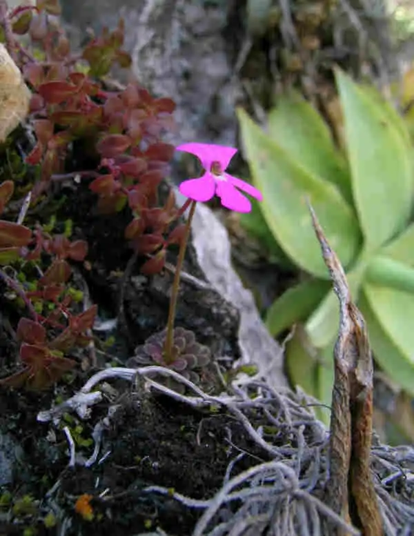 As I walked to the N face, I noticed this side of the mountain was very steep even with some cliffs. BINGO! Ping alarms rang in my head, as I looked at the rocky slope with sparse short pine trees. How hadn’t I seen this place before??? Although it was still early in the afternoon, that whole N face was completely in shade, because of its steepness. Perfect for Pinguicula !