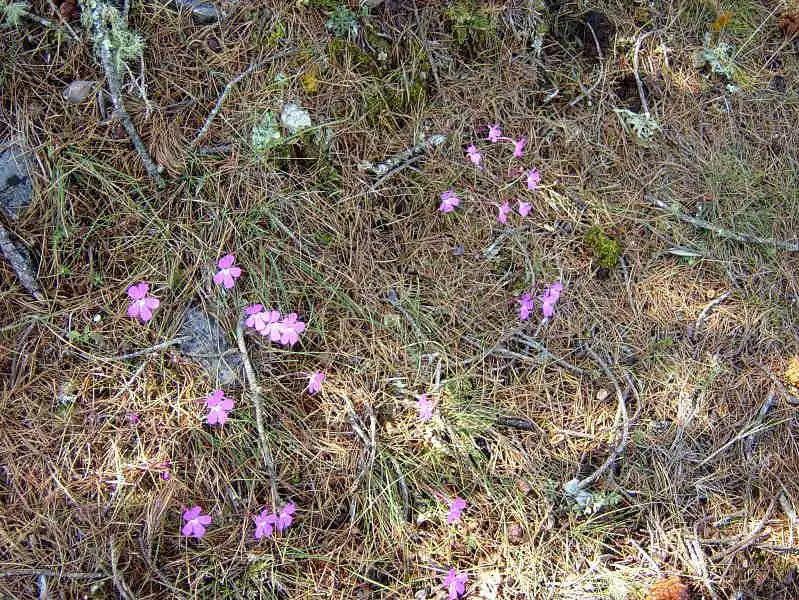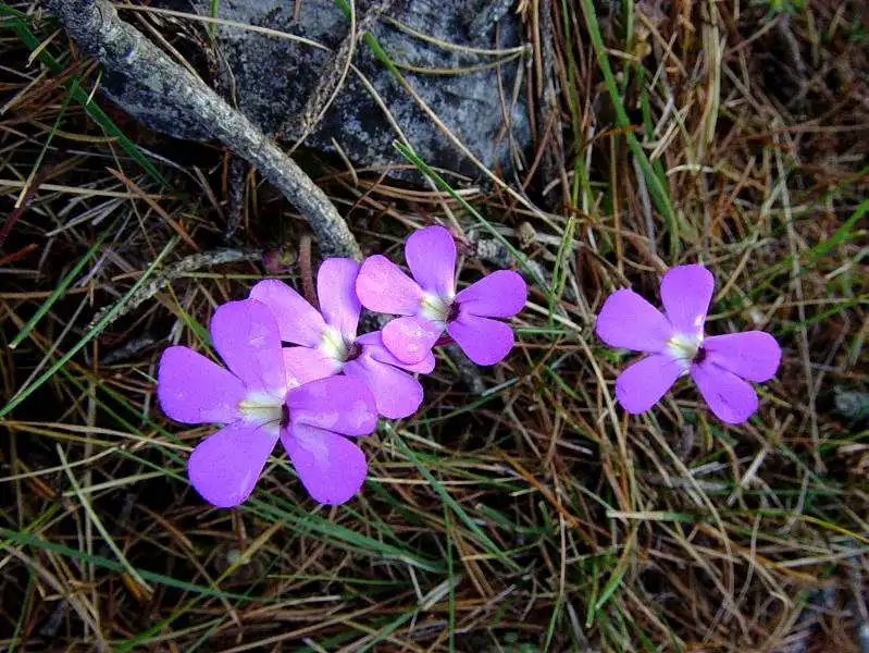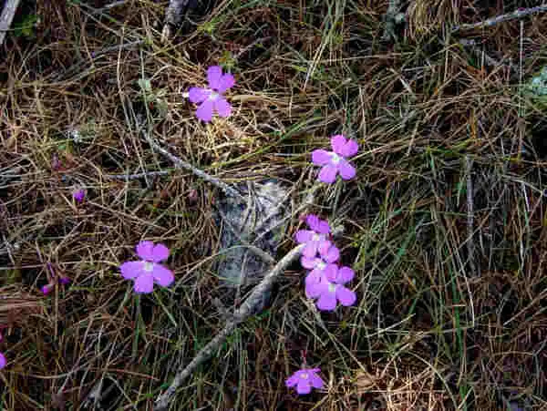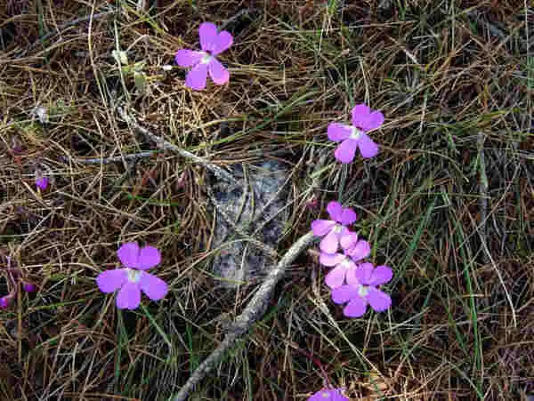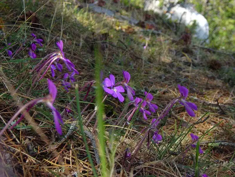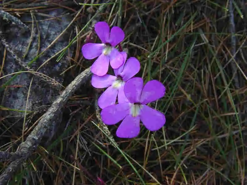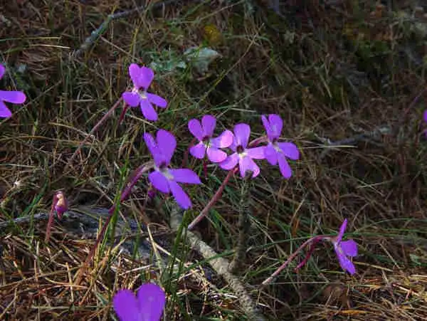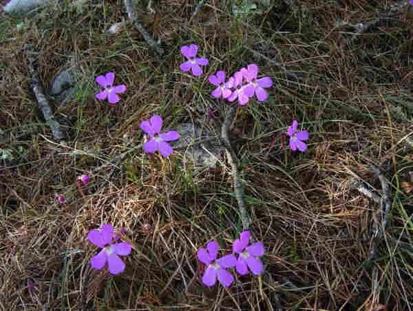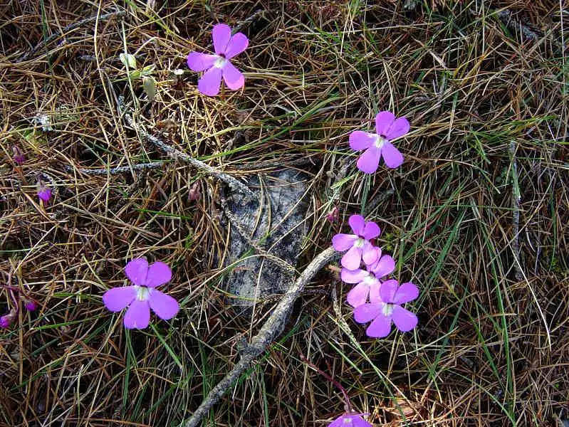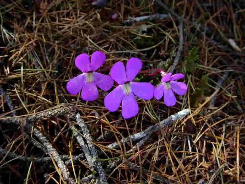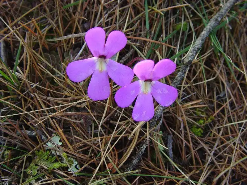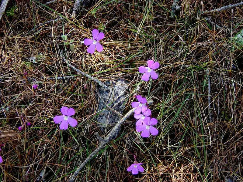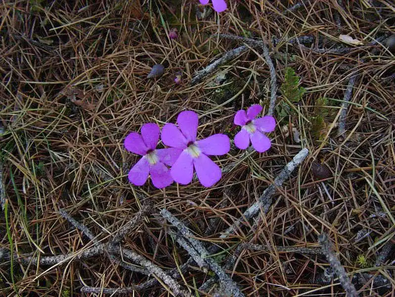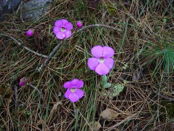 Flowers of Pinguicula ehlersiae (the resting rosettes are hidden under the pine needles Photo : Ruben Resendiz T. |