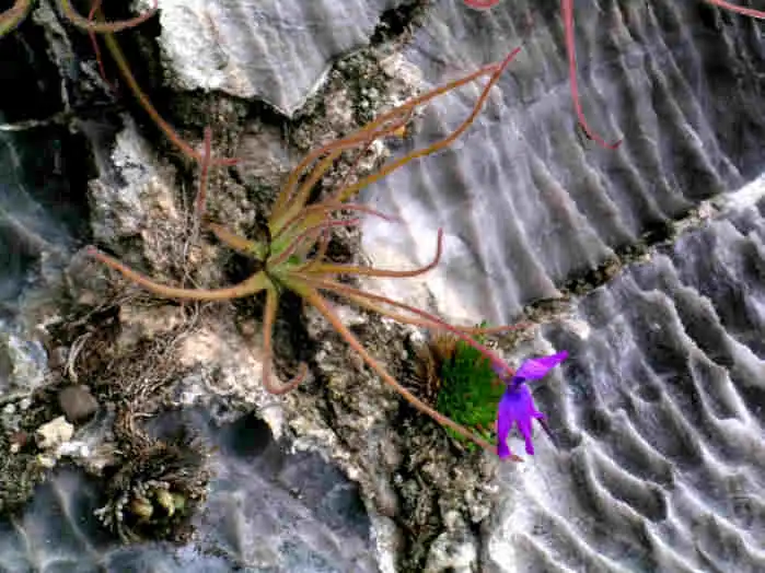 It was small, less than 2cm in diameter, with rounded leaves, the edges heavily curved inwards, reddish-pink scapes up to ~5cm high, and flowers with a beautiful mixture of colors. The free ends of the corolla were a light bluish-lilac, the tube white with dark-pink stripes, the anterior underbelly of the tube yellow, and the tip of the spur yellow too. This more or less matches the several descriptions of the flowers in the herbarium data we have, but dos not match the picture Eric sent us. So it appears that we did find the true P.takakii, but then what is that plant in Eric’s picture??? The habitat seemed very particular for P.takakii. It was abundant in a small area, mostly semi-shaded by larger bushes, growing in humid mounds of gypsum (?) soil with Selaginella (a common rosetted species). Although obviously an annual species, it will be a beautiful addition to any CP collection.