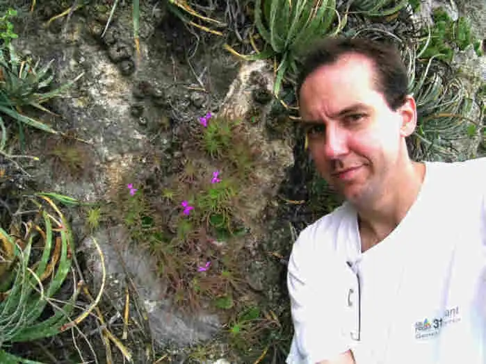 Fernando Rivadavia exhibiting some samples of the tiny Pinguicula takakii (collected as herbarium specimen). Photo : F. Rivadavia |
