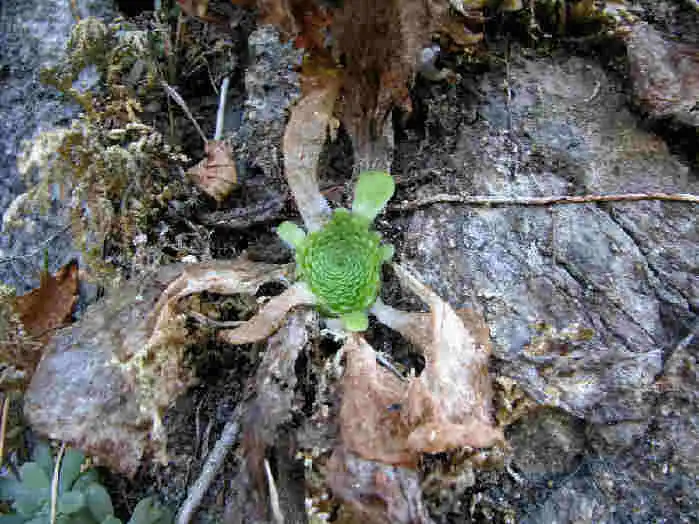 Pinguicula colimensis in habitat. Note the brown old summer leaves and the remaining green summer leaves. Photo : F.Rivadavia |