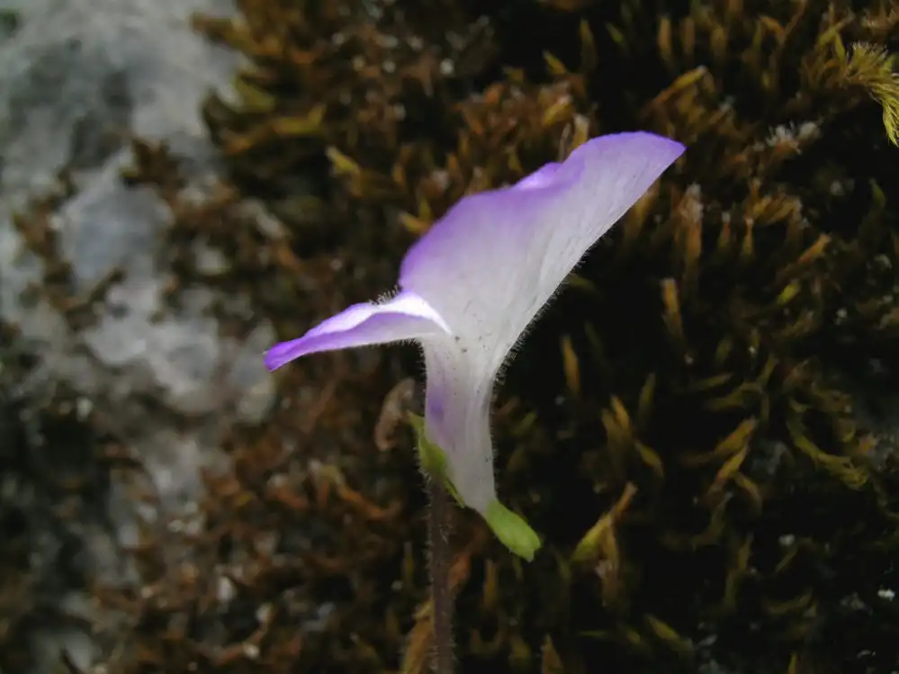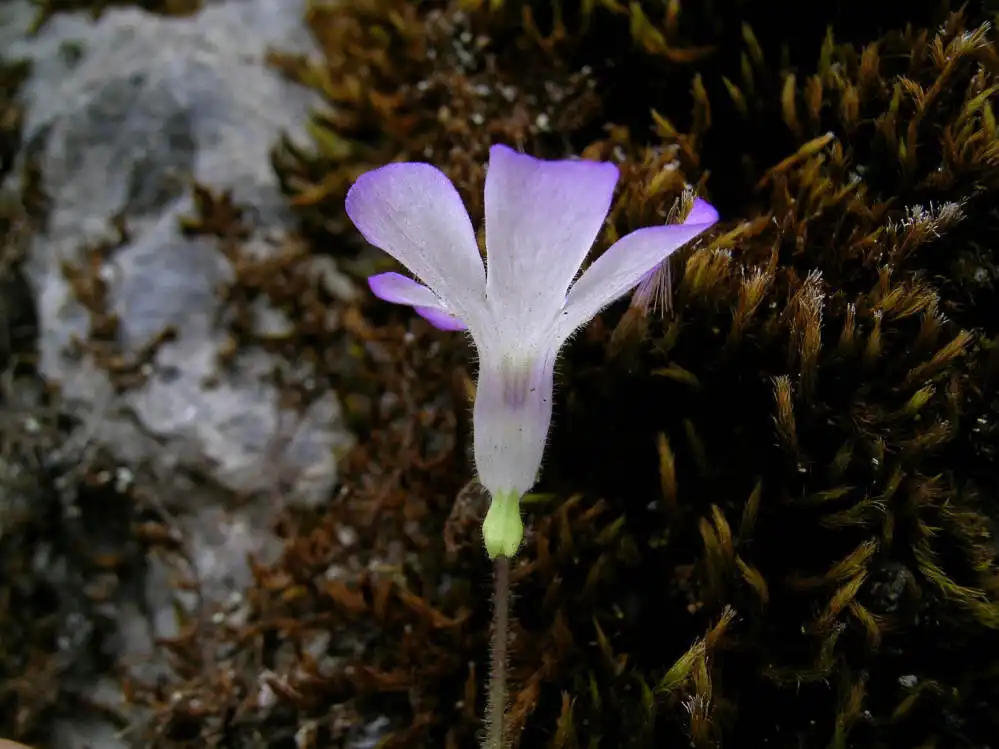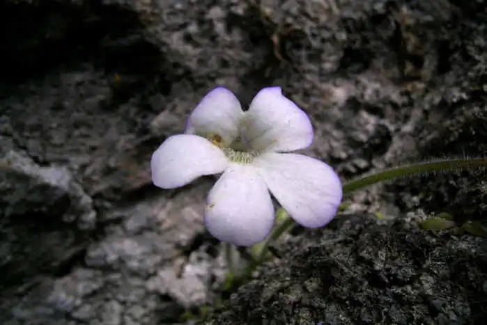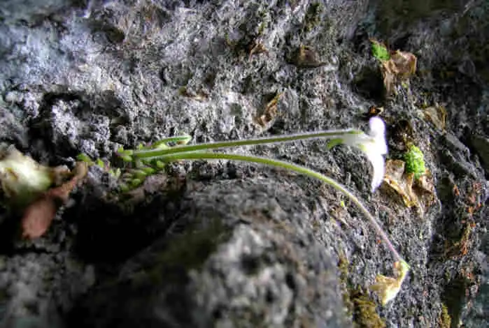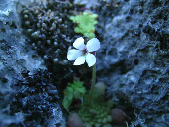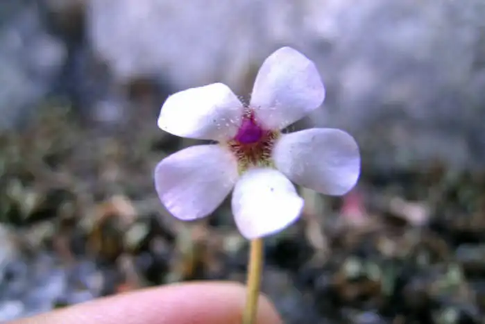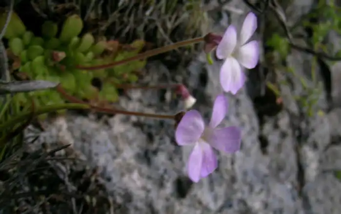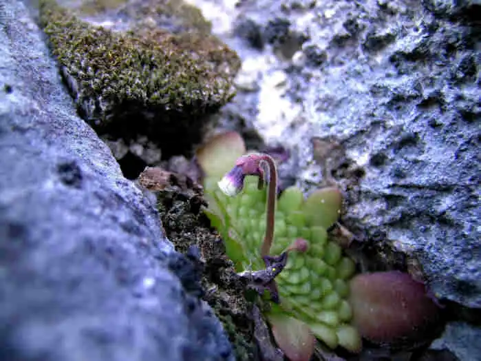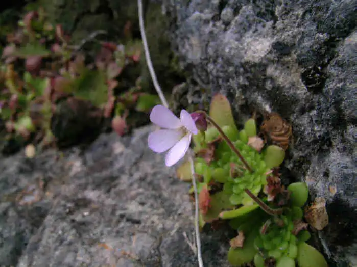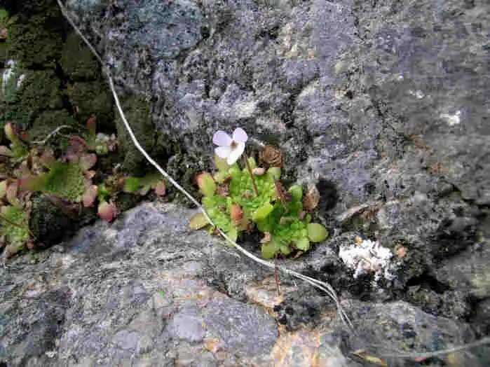 Flower ermerging from the winter rosette of P.mirandae. Photo : F. Rivadavia - December 2003 - |