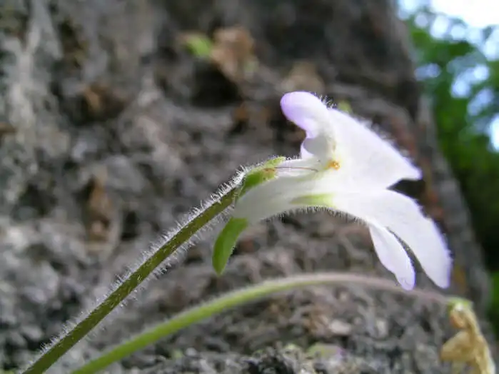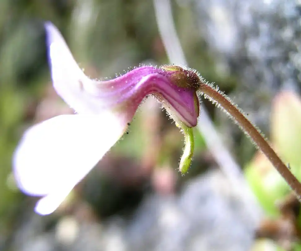 The flower of P.conzattii. Note the green spur and hairs. Photo : F. Rivadavia - December 2003 - |