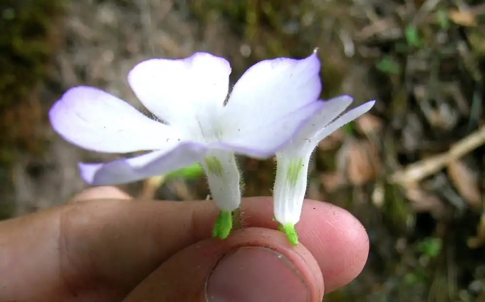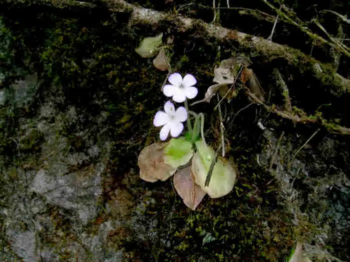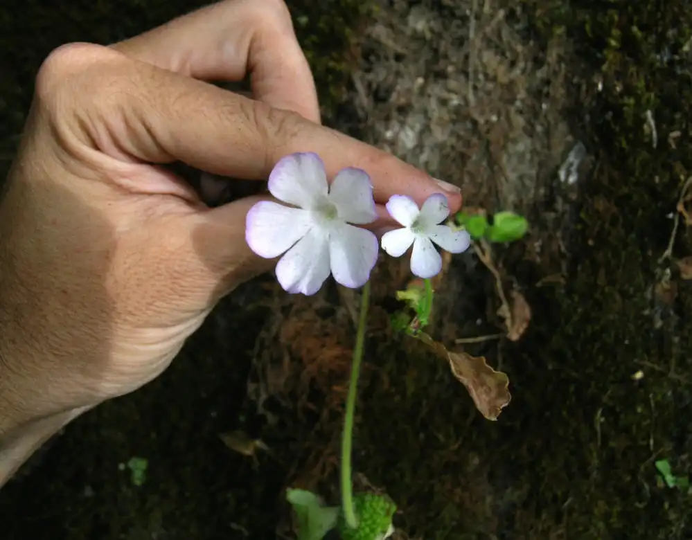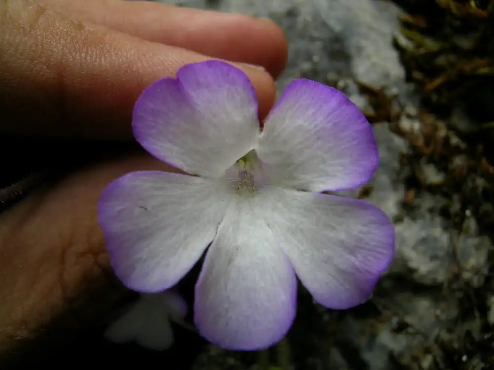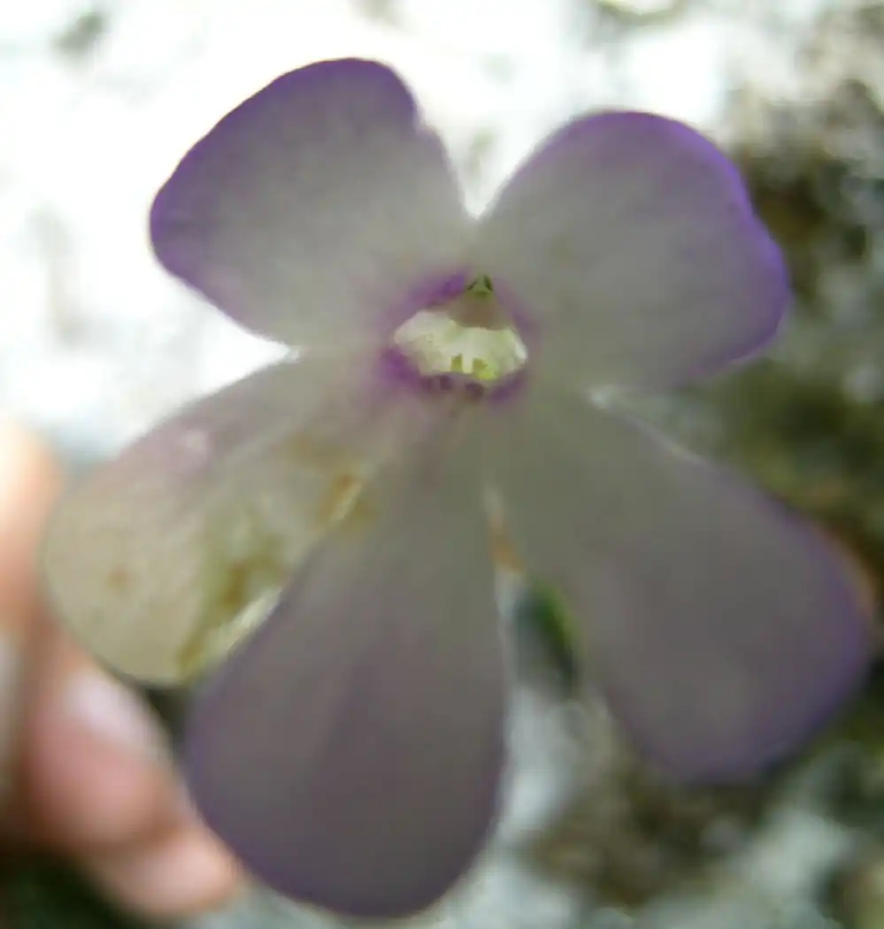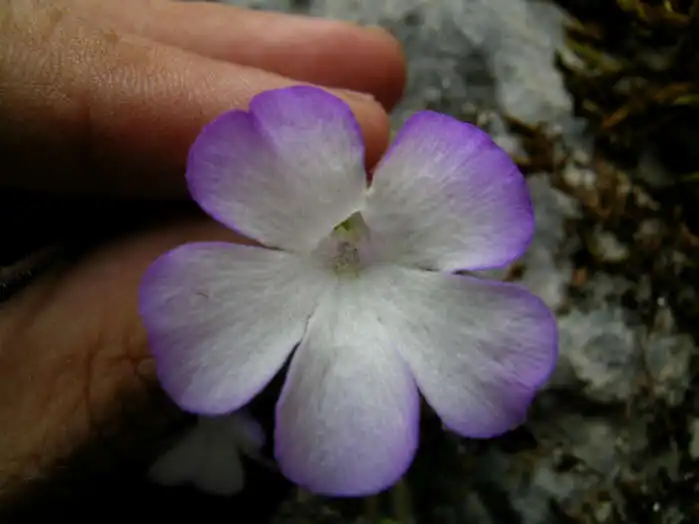 At least I saw other flowers and got several nice pics of these. What was interesting is that these were a little larger than the 2 flowers I’d seen 2 days before only a few meters away. Furthermore, flowers with white petal lobes did not seem to be the norm. Most were more or less tinged in lilac, especially near the edges like P.conzattii, but more diffused. Could it be age, more sunlight, or what? In the publication of P.mirandae there’s a drawing of a winter rosette with some stringy stolons that look more as if they belong on a small Utricularia species. I didn’t see anything like these and wonder whether they aren’t some other little plant which was accidentally collected with P.mirandae.