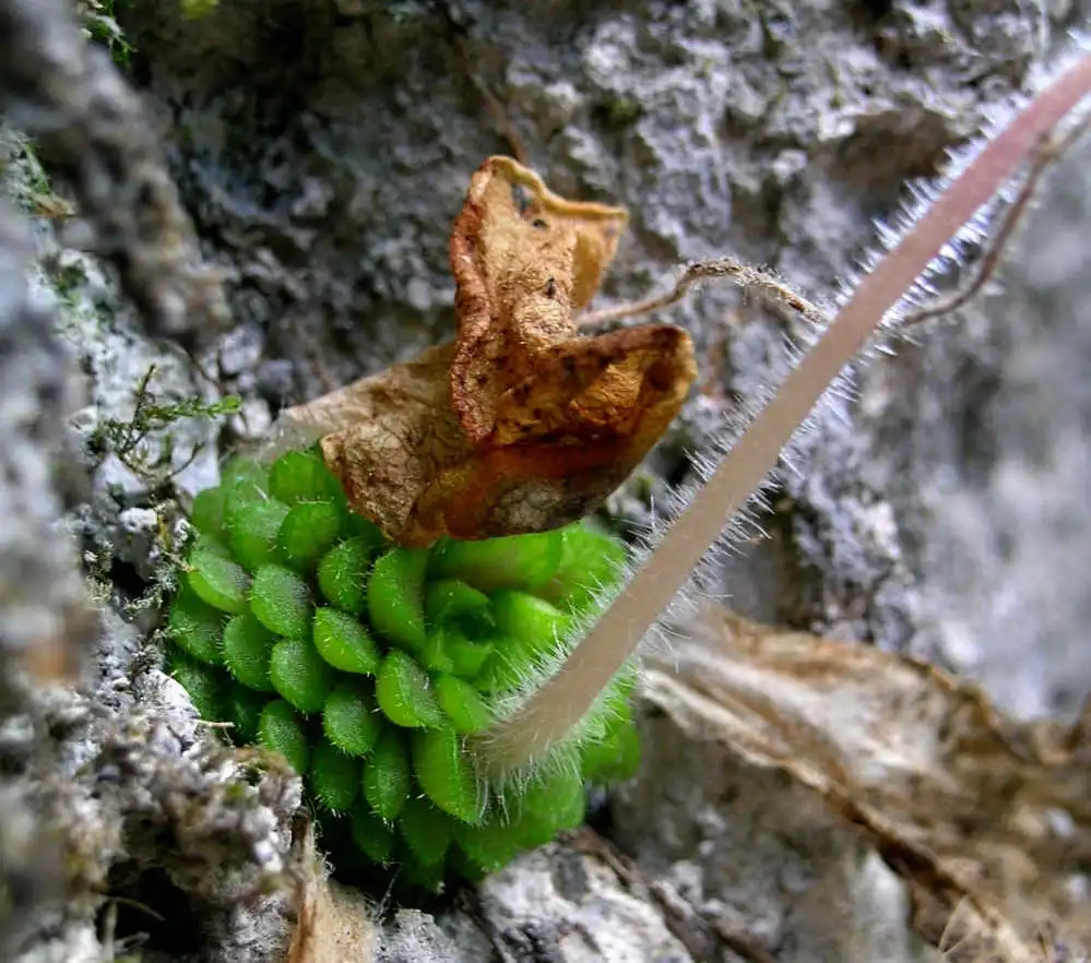 Close-up of the hairy scape emerging from the winter rosette of P.conzattii. Photo : F. Rivadavia - December 2003 - |