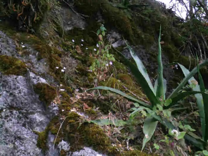 I stopped the car as best as I could along the narrow roadside, whipped out my GPS, and sure enough the bromeliad-covered wall was facing N. There must be Pinguicula on this wall! Instinct carried me scrambling up the steep hillside made up of loose rocks piled up around the base of the calcareous cliff faces. Too bad it only helped me get up, ‘cause by the time I finally stopped and looked down, seeing the road WAY below, instinct had chickened out and left me on my own ! Man do I get myself into some horrible places sometimes in the excitement !