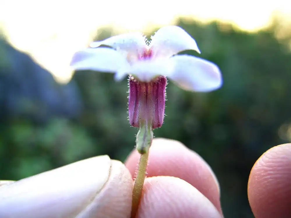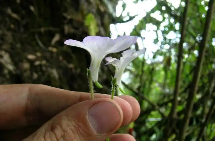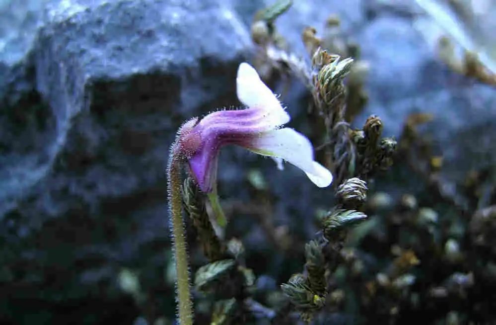 Albeit the difficult position, I was able to take numerous pics of the flowers while somehow still holding onto the cliff. It was strenuous, but worth it. These were possibly the 1st shots of P.mirandae (with or without flowers) in the wild. The flowers had a surprising mix of colors. The petal lobes were white, the corolla tube was flattened laterally, with a constriction near the center where there was a sharp 90 degrees bend. On the outside, the tube was colored a dark purple-pink with darker lateral stripes, the apical half containing 5 greenish-yellow stripes along the fusion points of the petals. These appeared more yellowish from the inside of the tube, which was also thickly covered with white hairs.