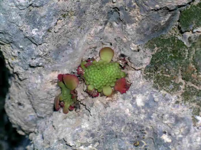 At the base of the next wall, I found a single rosette on bare rock, also with a young scape. This part was not completely perpendicular and I was able to climb the wall to a flatter area a bit further up. Calcareous rock is very rough, which helps you get a good foothold. But it also crumbles easier than you’d imagine, which makes it extremely dangerous when you’ve got a 50-100m drop behind you. Fortunately, I got away from this one safe, although with several deep scratches and cuts in my arms and legs due to the jaggedness of this coral-like rock, which very easily cuts into the skin.