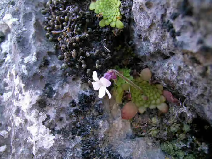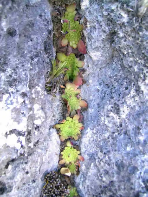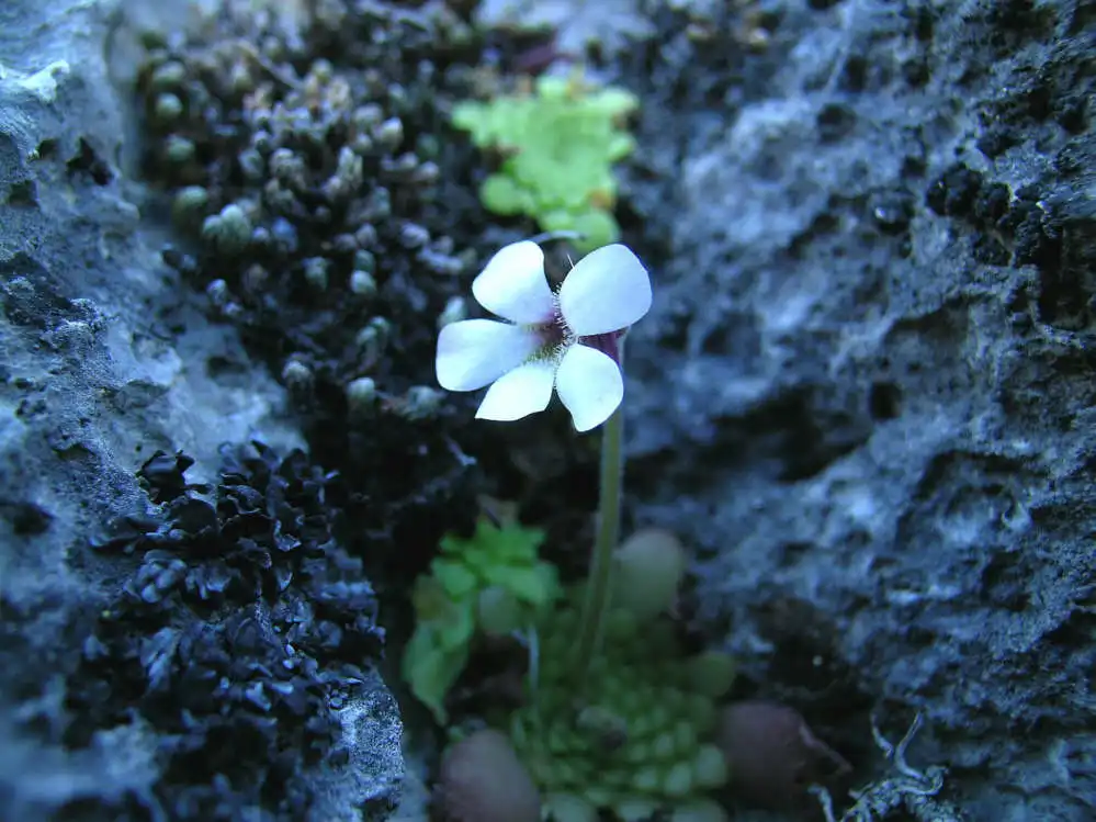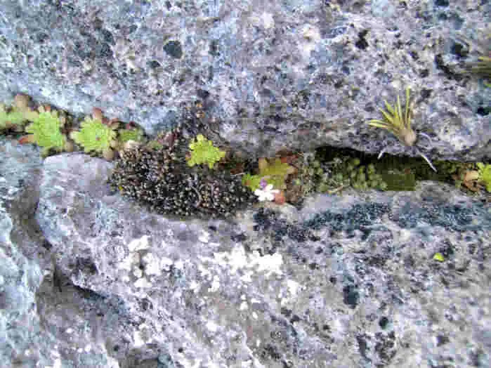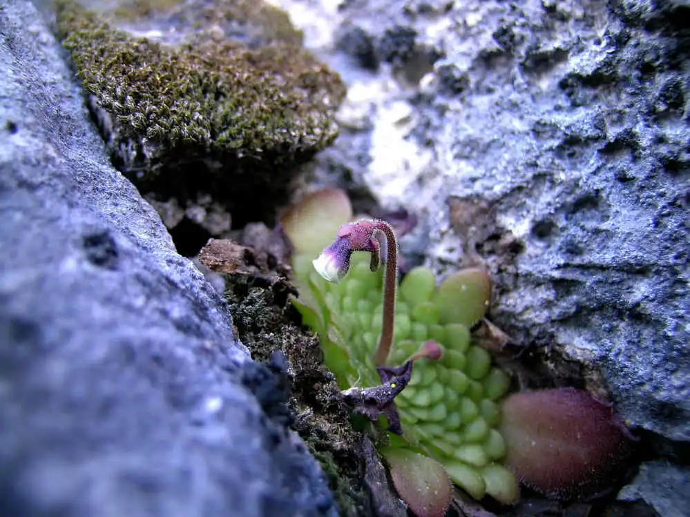 Catching my breath on the flatter area, I found more rosettes of this mysterious Pinguicula growing in dry mosses inside vertical cracks a few cm deep.