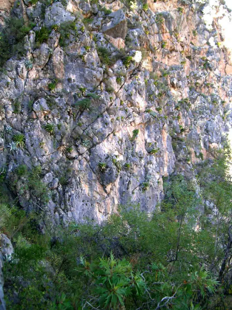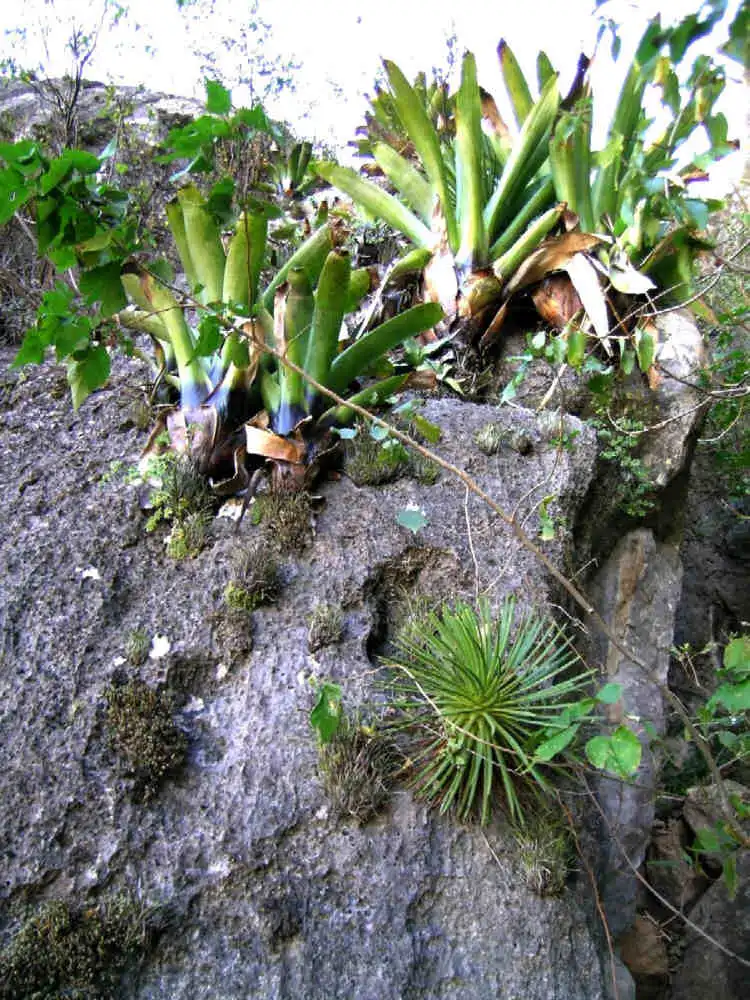 This time, as I drove up the mountains, I couldn’t see much of the canyon to my right (passenger side). So I was admiring the dessicated hillsides to my left, when all of a sudden at ~1800m altitude appeared a huge calcareous cliff. I hadn’t seen this cliff before and my attention was drawn to the sight of huge bromeliads of the water-tank type (Vriesia??). These were very numerous on the cliff face and it struck me as a rather odd view, since to me these compact rosettes were typical rainforests epiphytes - and not desert dwelling plants. Bromeliads in deserts are usually of the prickly Hechtia type with narrow leaves which couldn’t hold any water. So I immediately thought: there must be above average humidity in this spot.