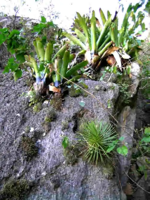 A bromeliad-covered wall facing North, the habitat of P.mirandae Photo : F. Rivadavia - December 2003 - |