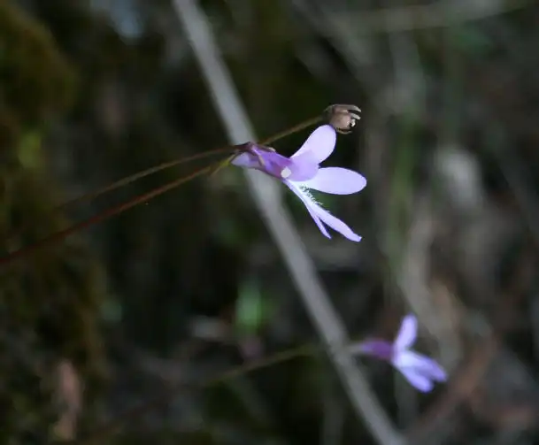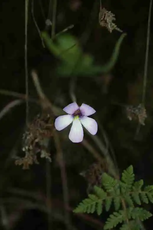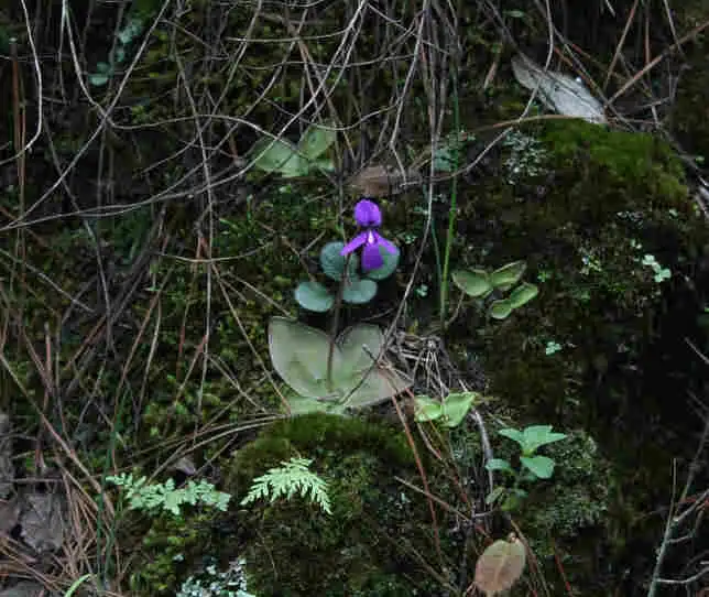 Continuing the road for some further kilometers, I have suddenly recognized some pale violet flowers on the cliffs. Pretty sure that it was a Pinguicula, I stopped the car at the next possible place and walked back. Accessing the plants was not easy as the soil was wet and slippery. But it soon turned out that it was P. parvifolia. A lot of plants were in flower showing a quite variable flower in shape of the corolla lobes and in colour. The flowers varied from a whitish- pale violet colour to a darker blue-violet coloration. Most of the plants had 2 to 3 leaves formed, but some flowers appeared out of “nothing”, as the winter rosette is buried in the moss or substrate. The rock on which the plants were growing seemed to be of volcanic origin (for sure it was not calcareous), but I will have to do more geological investigation to confirm my assumption. Further on the road, there were also some spots with P. moranensis. Some of them were in flower. The flower colour was a dark violet, varying between more reddish parts to more blue violet coloration. Nothing spectacular (like at the Molango site), but very nice. The rosettes had often 3 to 4 leaves and were of a green to reddish colour.