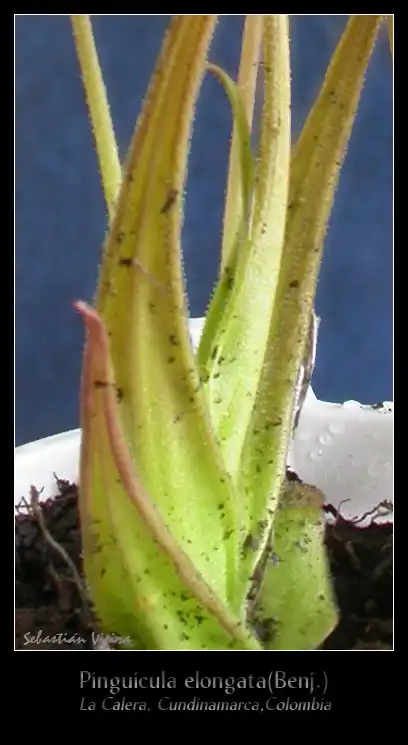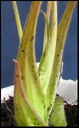 Also notable, is that the plants have two kind of leaves. The oldest leaves at the base of the rosette, are wider and shorter, and stay flat aligned with the soil. The second kind of leaves, are the erect elongated leaves, with pink tips that gave this species its name. Usually you will find that plants only have two or three of the flat leaves, and all other leaves will be of the elongated kind.