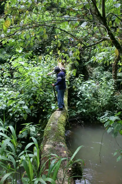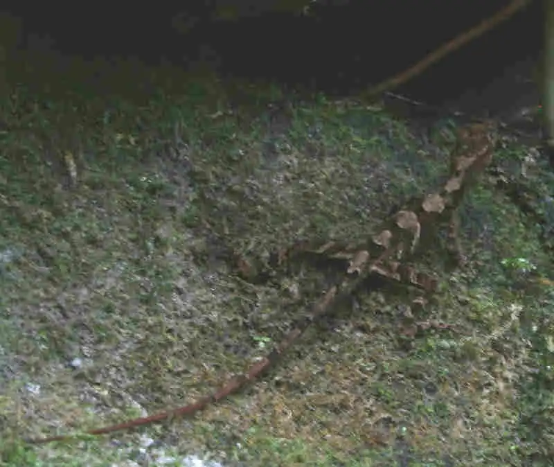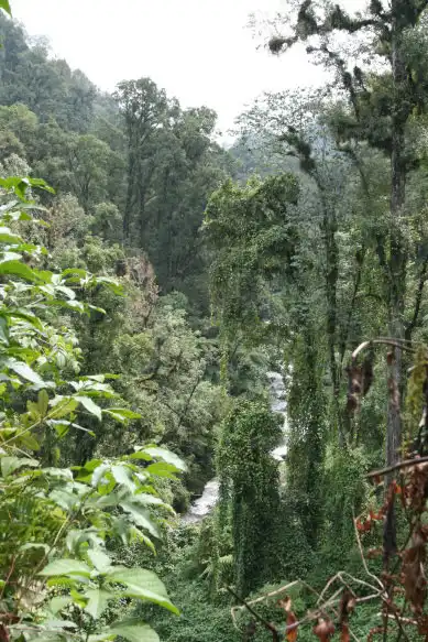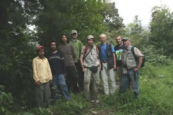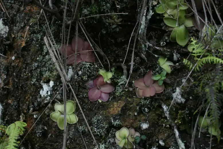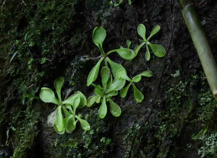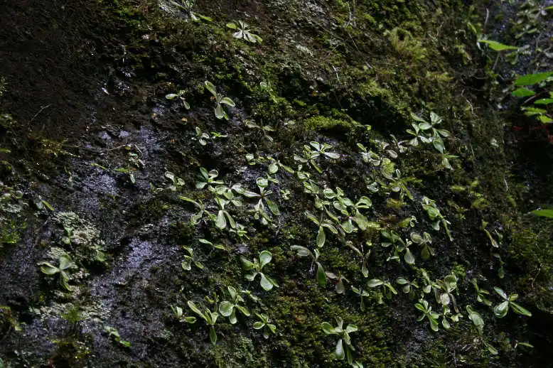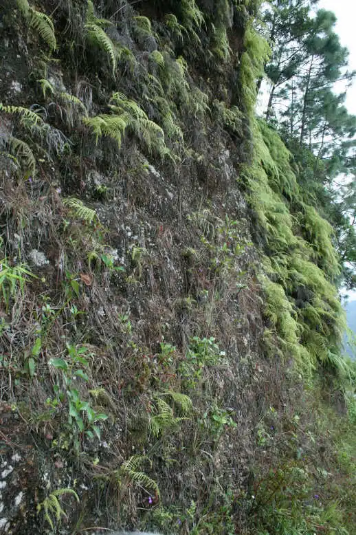 The next morning we continued our way direction Atzalan, where there was another site of P. emarginata. We stopped the car before the bridge Fernando indicated us and were looking for the path down into the valley. There was a very thick vegetation, with a lot of tree ferns. It was a kind of a cloud forest, as humidity was not only coming from the river but also clouds were coming into the valley quite often. But where was that path to get down to the waterfall? As we were not finding anything, we walked towards the small village nearby and asked some people for the way. As they were not seeming having anything else to do this day, we hired them as a guide and they took us down to the river. We explained them that we were looking for a waterfall called Cascada de Oliguí(as the plants shouldn’t be to far away) and it seemed that they were knowing, of what we were talking. After a slippery descent down to the river, we were in front of a waterfall, but the vegetation was that thick, that no Pings could grow here. Further we had to cross the river on a mossy, slippery tree trunk, that was laying over the river. On the other side the Mexicans continued with their machete to made us a walkable way and we continued in the wet and humid forest. It was a really nice walk, but we were not seeing any Pings. Another waterfall. Were the Pings somewhere here? We looked around, jumped over stones to get to the other side of the river again, but no Pings at all. Then we continued back a small steep path up towards the road again. We were already hearing the cars driving up, as we passed by a very shady cliff, and there they were!!! About hundred P. emarginata plants were growing on a wet cliff. None of the plants were in flower, so definetely this species is not flowering all year round.