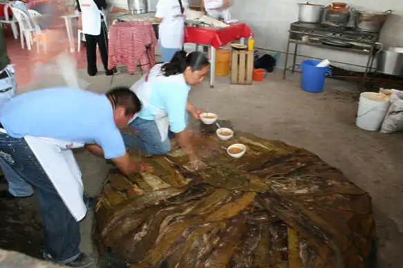 The next morning we were driving the way back towards Pachuca. It had rained a lot the night before, as the rivers we crossed had a lot of brown water. Not to imagine, how the Toliman river now would look like, probably we would have never got to the plants on that day. At Ixmiquilpan we stopped at the road for breakfast. As there were a lot of cars standing, it must have been a known and hopefully good place to eat. It turned out that people from the nearby village were preparing sheep, cooked in a hole in the soil covered with banana leaves. The sheep meat (really unusual for Mexico) was very delicious and we continued our way to Pachuca.