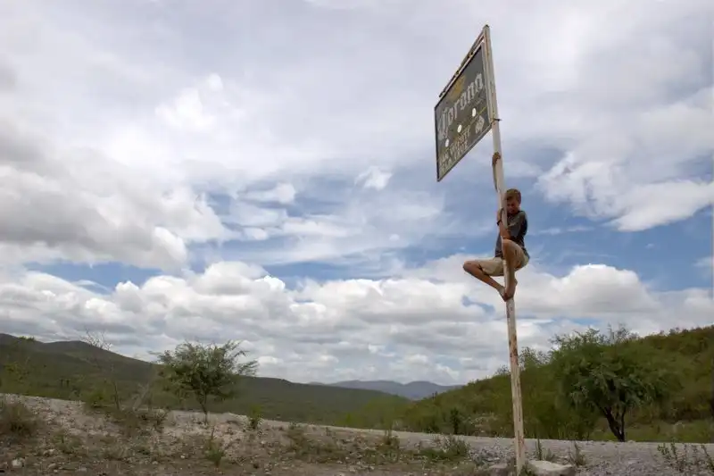 Waiting for a bus to happen by in the desert. Notice how the signboard is not actually a beer ad, but a sponsored turnoff sign for the local town.