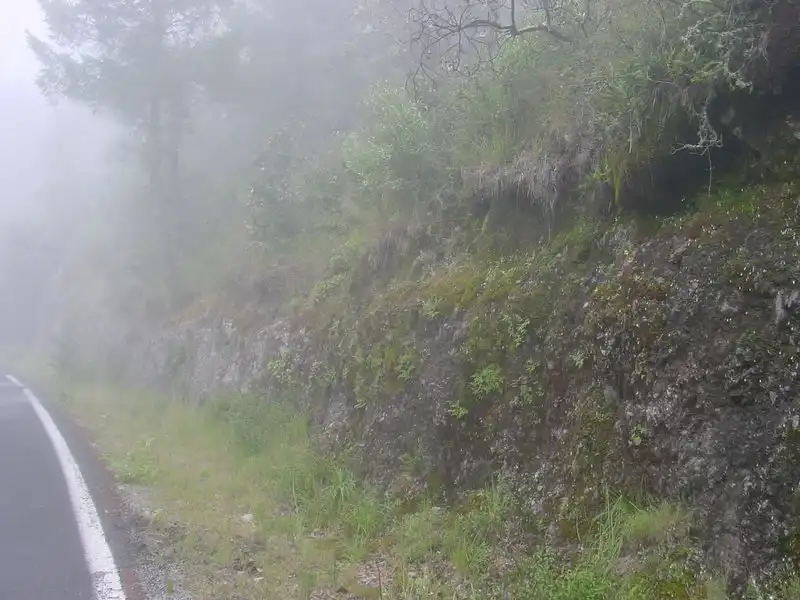 When the GPS unit showed we were within half of a kilometer of the P. acuminata site, we started convincing the driver to let us off. This part is always tricky, as drivers are always sure we must be making a mistake, and actually intend to get off at the next town like everyone else. This time we were relatively persuasive and only had to walk a few hundred meters from the drop-off point, at which point we found a roadside cliff covered in moss and P. moranensis. Somewhere around this time rain started to drip through the fog.