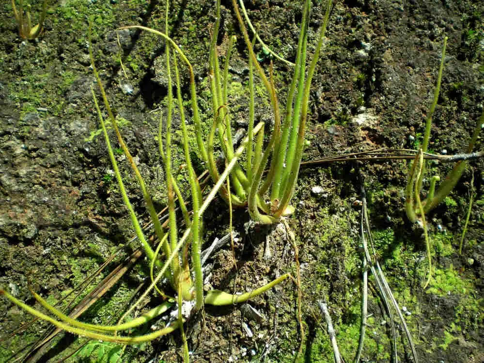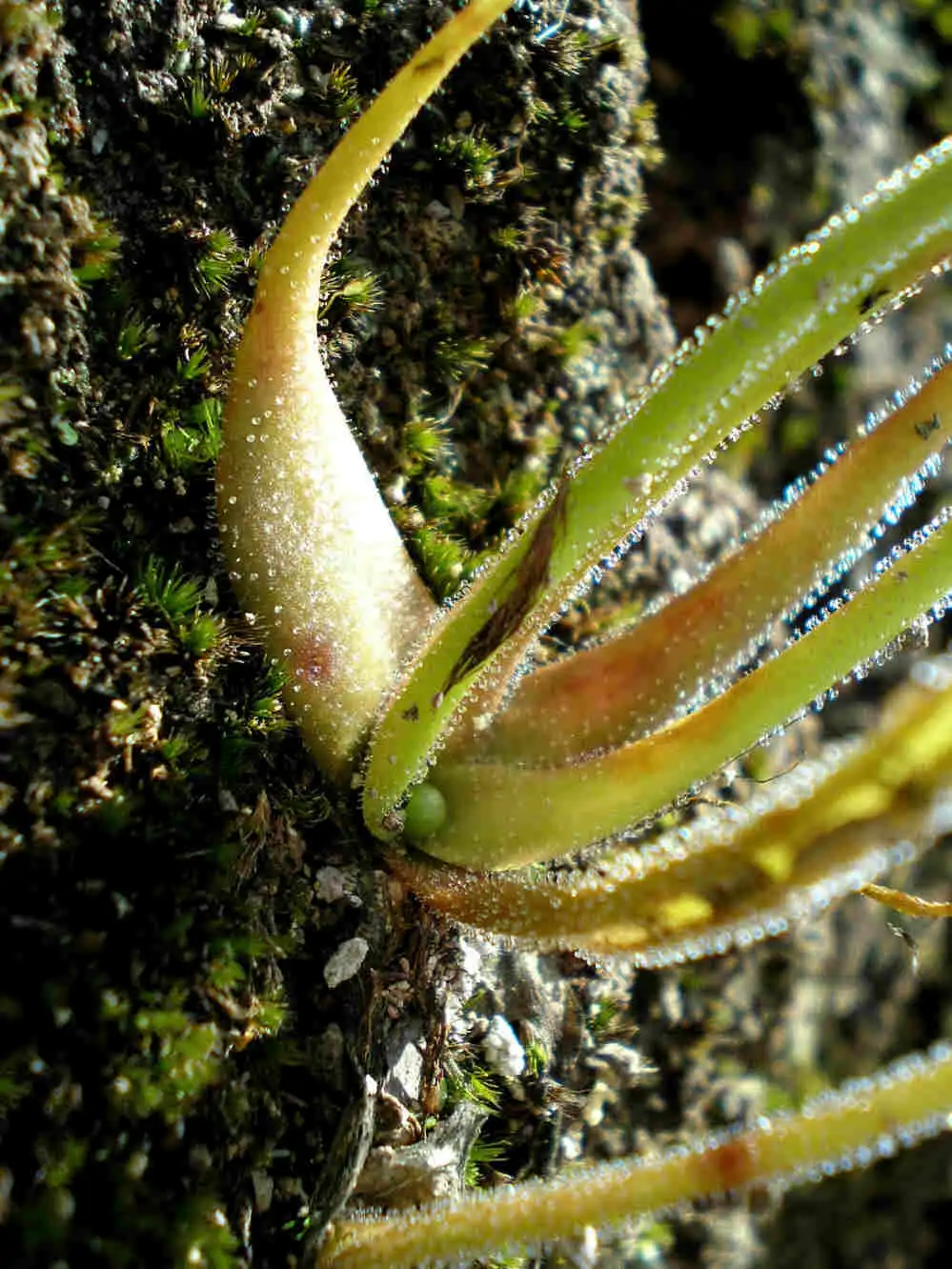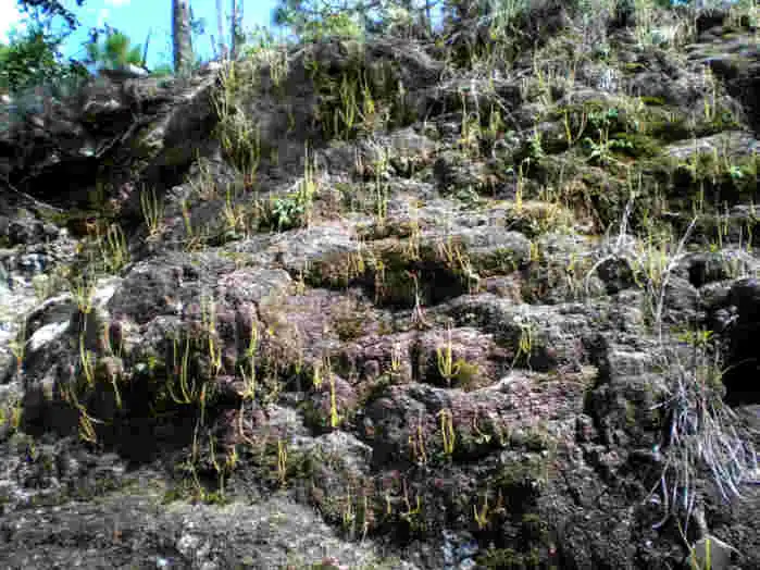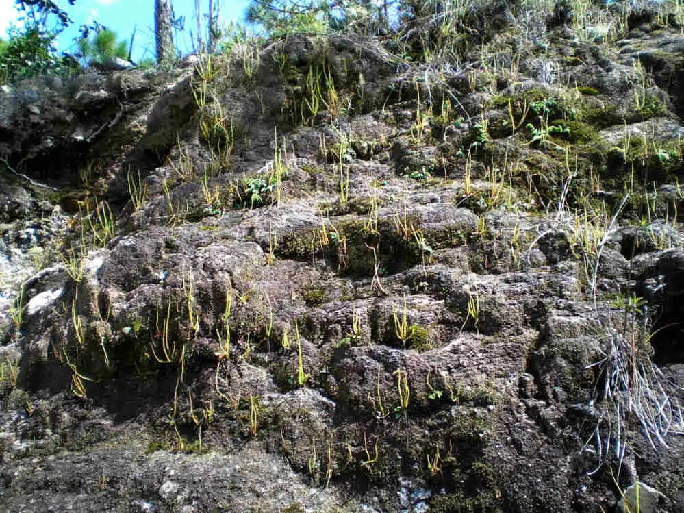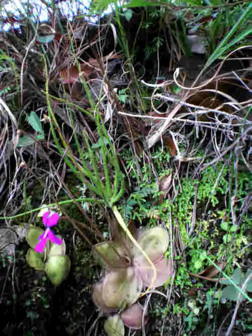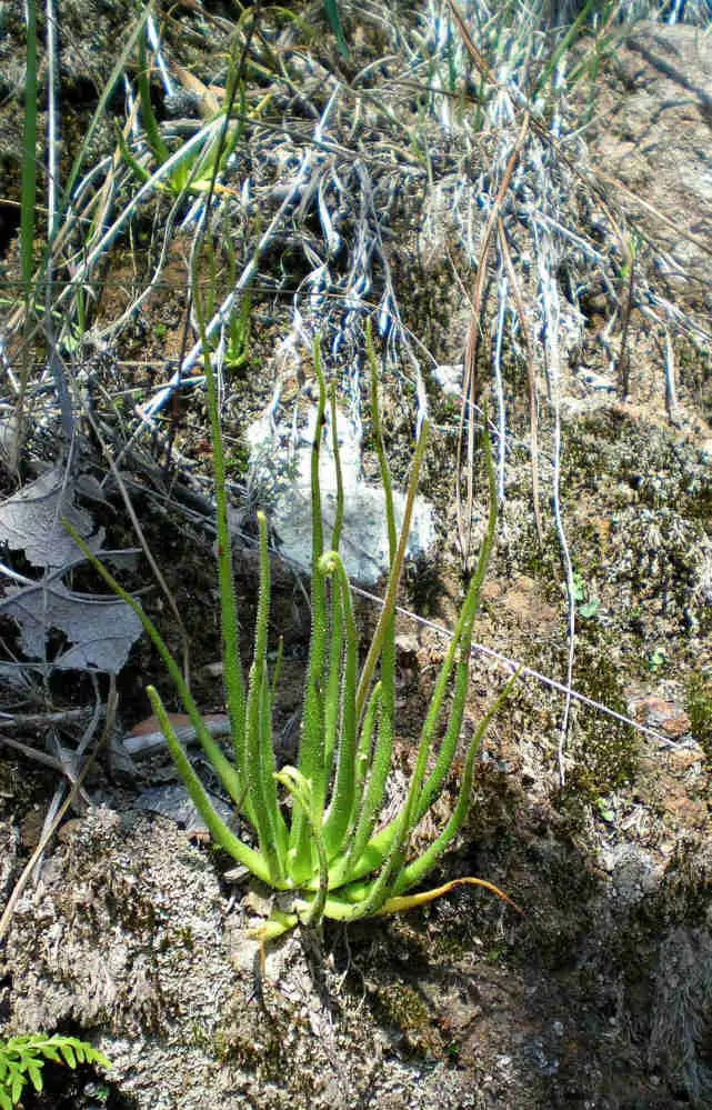 To my deception, not a single flower was left on P.heterophylla. It is nonetheless a beautiful and unusual Pinguicula with its long slender leaves, and I thoroughly enjoyed myself photographing hundreds and thousands of P.heterophylla growing along sunny slopes by the roadside facing east and south. I was even briefly distracted from CPs (I admit it!) by a very unusual orchid with an inflorescence packed with numerous green flowers. Although countless P.heterophylla were observed at El Huixteco, only 2-3 live scapes with fruit were found. It was obviously WAY past flowering season for P.heterophylla.