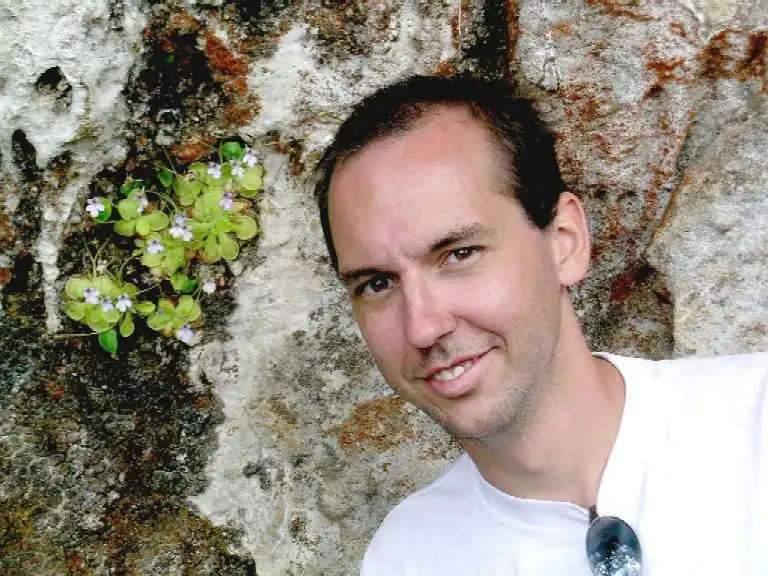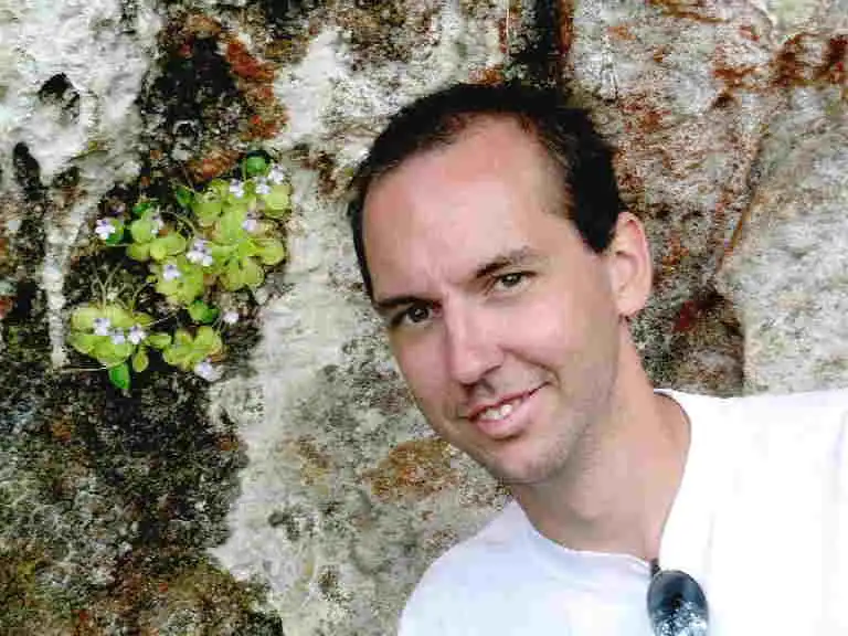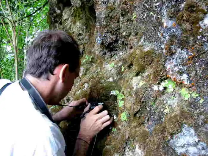 Fernando smilling close to P. clivorum. He can be happy : his personal species counting now count one more rare species of Pinguicula . Photo : F. Rivadavia |