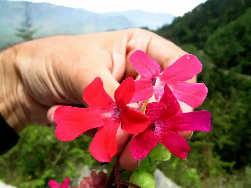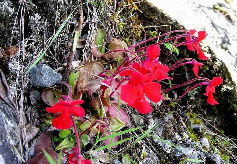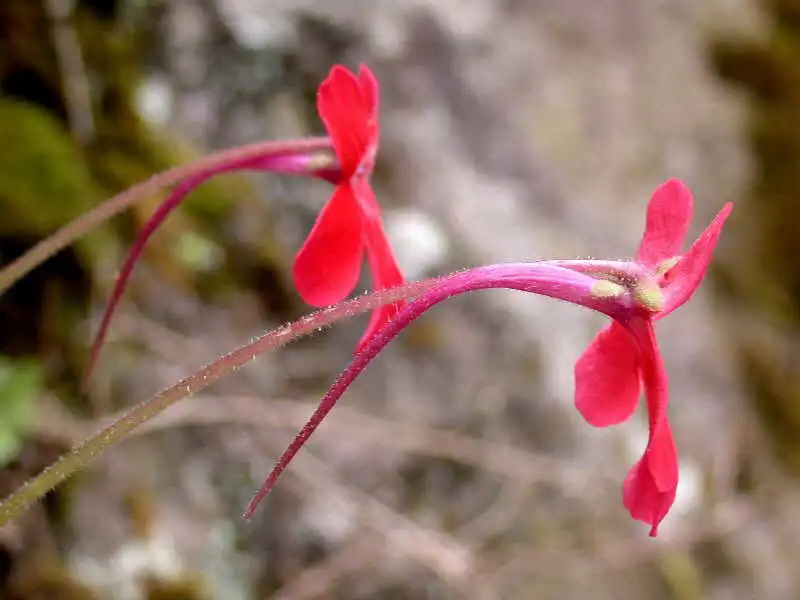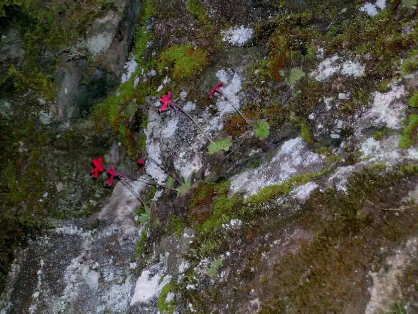 So I convinced everyone else to follow me up. The problem was how?! The roadside was almost all sheer cliffs. A few hundred meters further ahead, the road crossed a stream and we decided that it was probably the best spot to attempt our climb. As we walked there, we saw more P.laueana on the walls, some of these within reach. One of these flowers was a beautiful salmon-pink color, while another clone was dark-pink. But these were the only ones we found that day which were not a deep blood red or dark orange-red. The rosettes and flower scapes varied from green in color to pinkish-red or dark red, depending apparently on sunlight exposure. Even the spurs and backside of the flowers seemed darker in color in more exposed spots. We found both summer and winter rosettes.