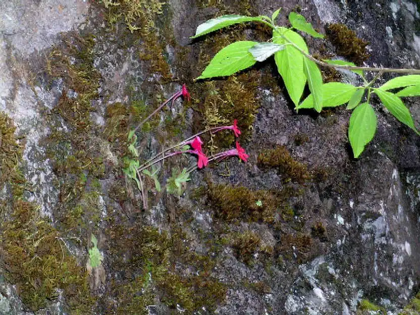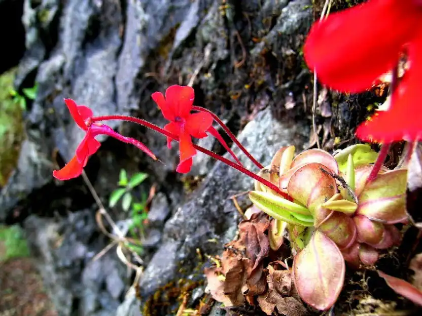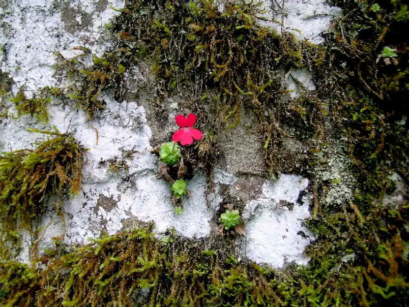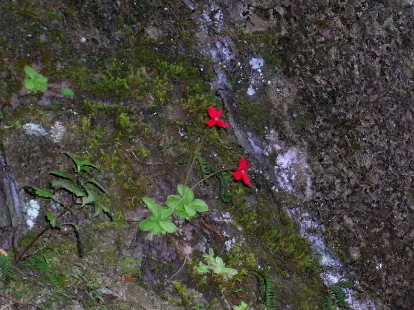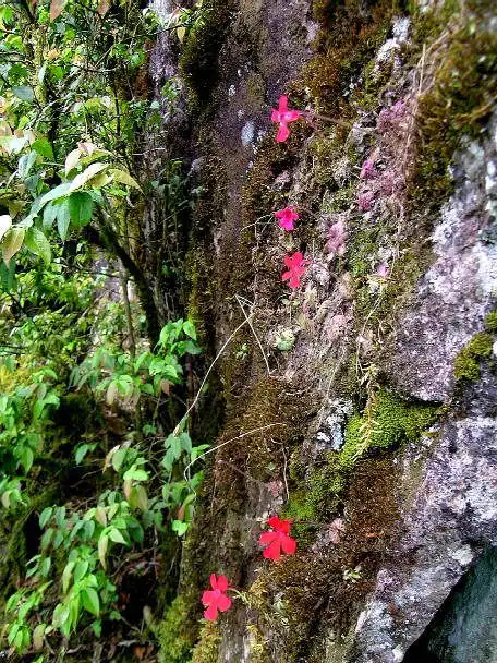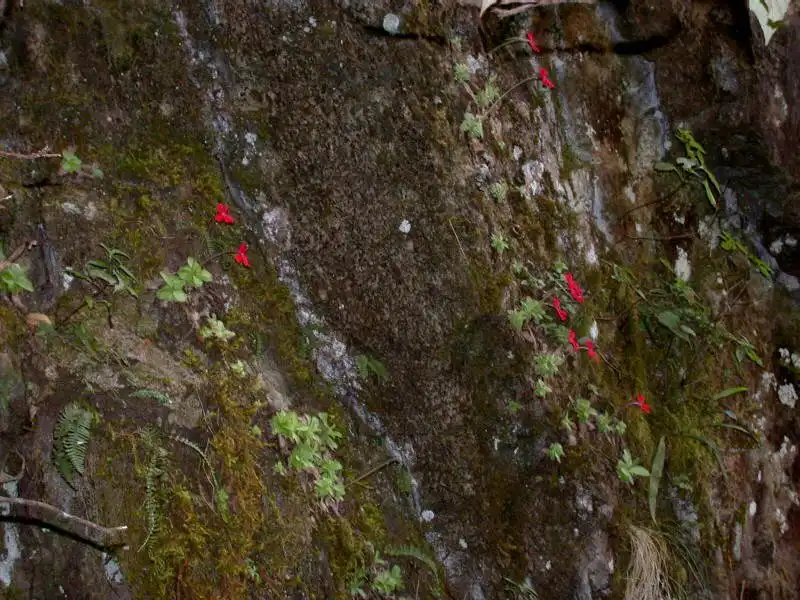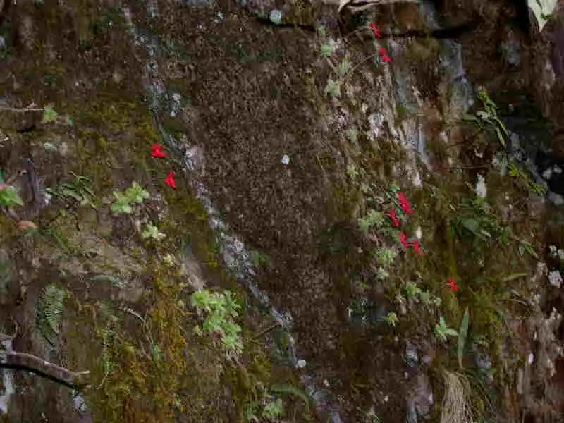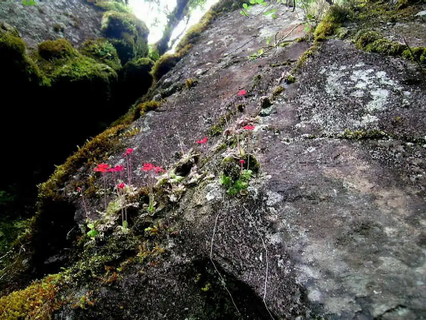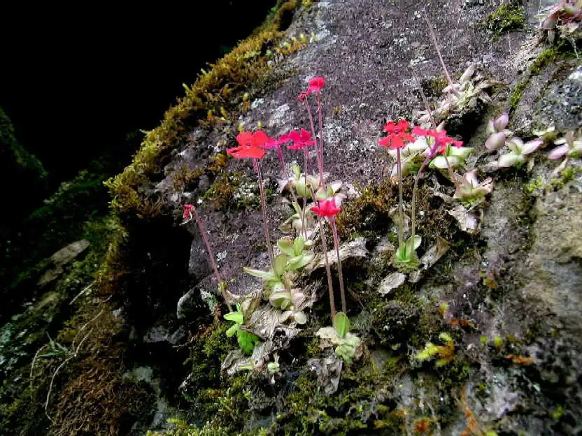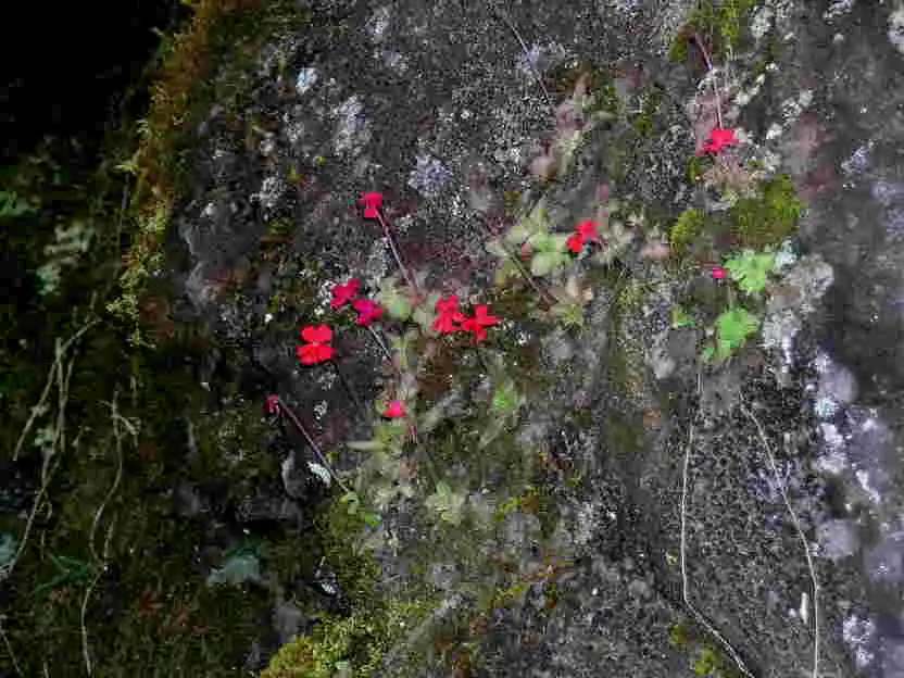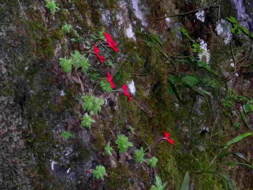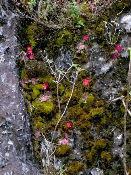 What a sight it was! We had finally found the holy grail we’d been seeking: P.laueana rosettes and red flowers everywhere! And the more we explored the base of that cliff in either direction for several dozen meters, the more P.laueana we found. The habitat was semi-shaded by trees and the walls mostly dry or humid, in some spots with dripping water. Although the cliffs were covered with mosses, it wasn’t that yellow moss seen in Lau’s pictures. Maybe that was higher up.