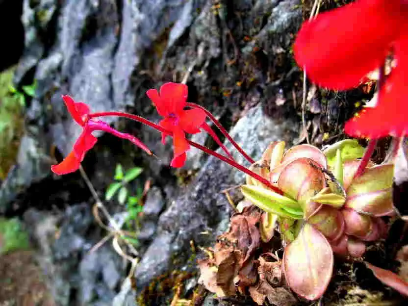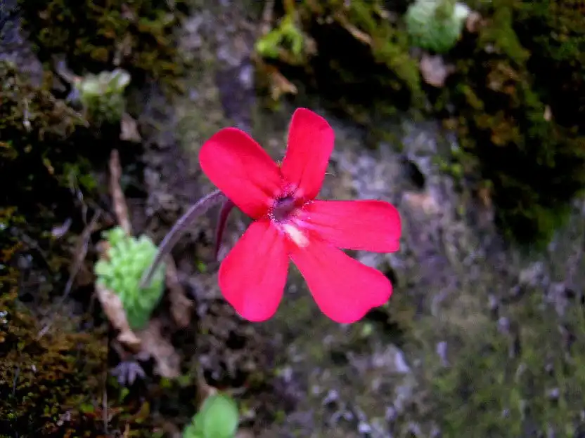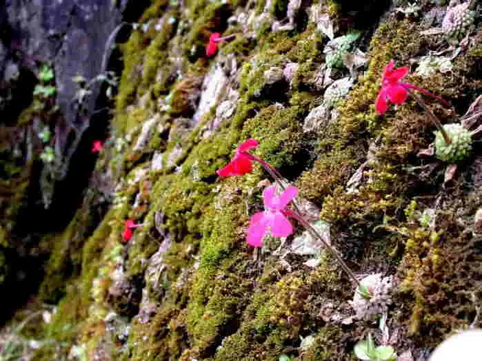 These thoughts were soon drowned out of my head as Ed began shouting at the top of his lungs: “RED FLOWERS!! RED FLOWERS!! WE FOUND PINGUICULA LAUEANA!!!” and laughed hysterically. I quickly parked the car and we all jumped out. And sure enough there they were, in all their red splendor, sticking out from the green mosses on the black rock face. I had never even seen P.laueana flowers in cultivation, I only knew them from pictures. So it was true, they did exist after all!