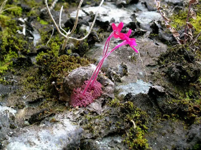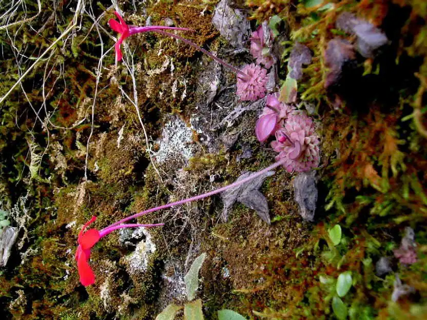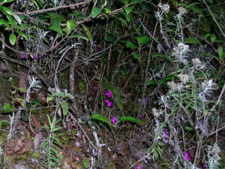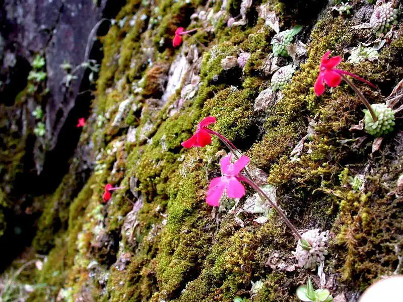 Scampering back the way I’d come, slipping and sliding over mossy rocks and tree trunks, I fumbled my way down the valley and then up the opposite side, calling out at regular intervals to check if I was heading in the right direction. It was arduous terrain with many loose & slippery rocks partially hidden by a green carpet of short plants. It was almost like walking through thick snow or deep mud. Not to mention the thin air at over 2500m in altitude. Huffing and puffing, my lungs bursting, I finally reached my companions. They were standing at the base of a small rock wall with several flowering P.laueana. Beautiful! – I said – But not enough, let’s search for more!