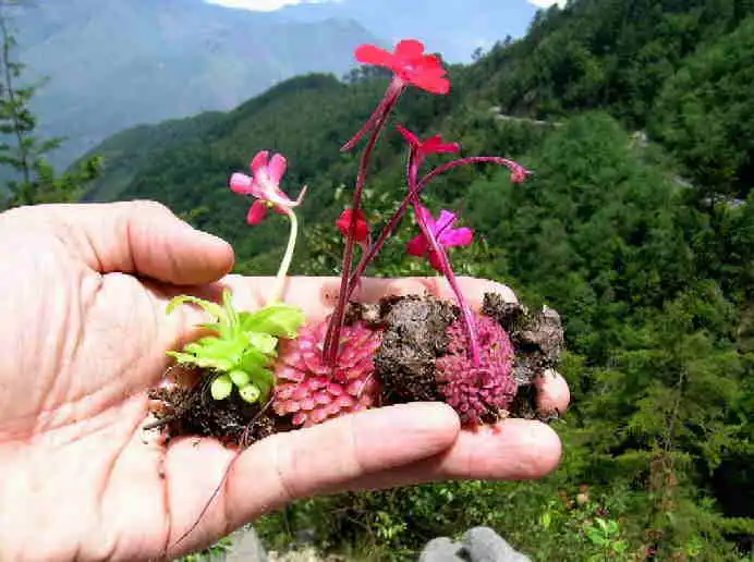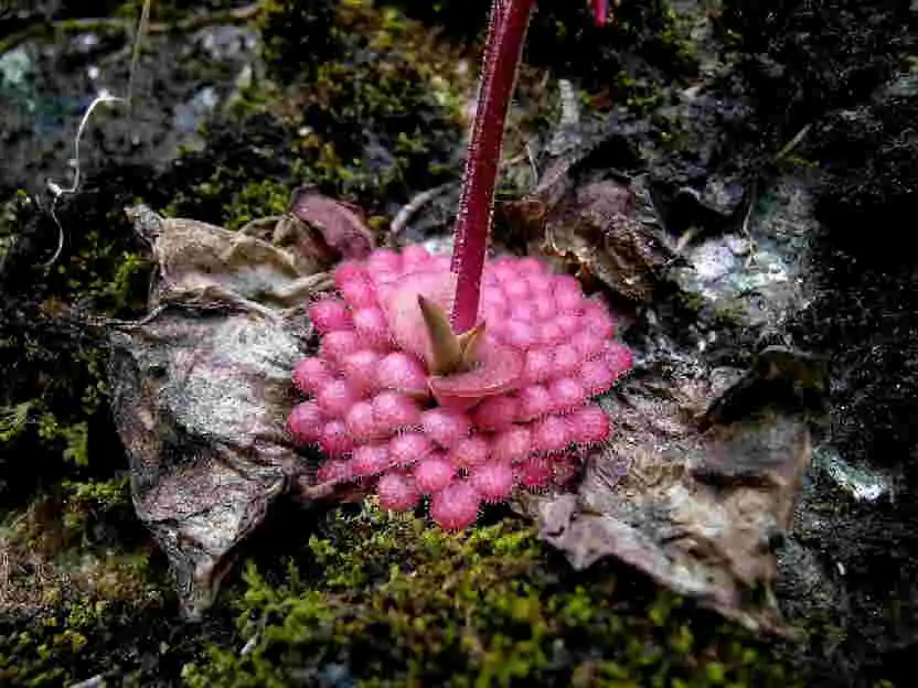 Walking further on, we reached the stream and began clambering carefully over the slippery moss-covered rocks littering the streambed. We made very slow progress at first, it was all very smooth and wet and the underbrush often thick. After climbing a while, we split up to cover more area and explore opposite walls visible from the small valley we were in. I went off alone and began circling the base of a cliff. About 20 minutes later, having walked a long way around the mountain, I heard shouts in the distance. I couldn’t really make out what was being said, but I didn’t have to. I knew what all the excitement was about. It could only be more P.laueana!