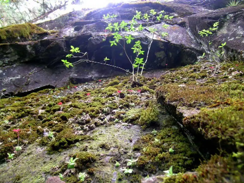 Pinguicula laueana in its habitat. The red spots can be missed even if this area is not receiving a lot of light (hence the green rosettes). Photo : F. Rivadavia |