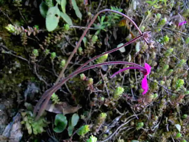 Pinguicula laueana in its habitat, growing among mosses. Note the cerise coloured flower like the P. laueana 'CP3' we can find in culture (use your back button). Photo : F.Rivadavia |