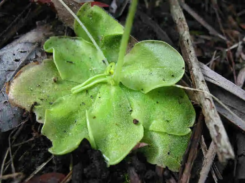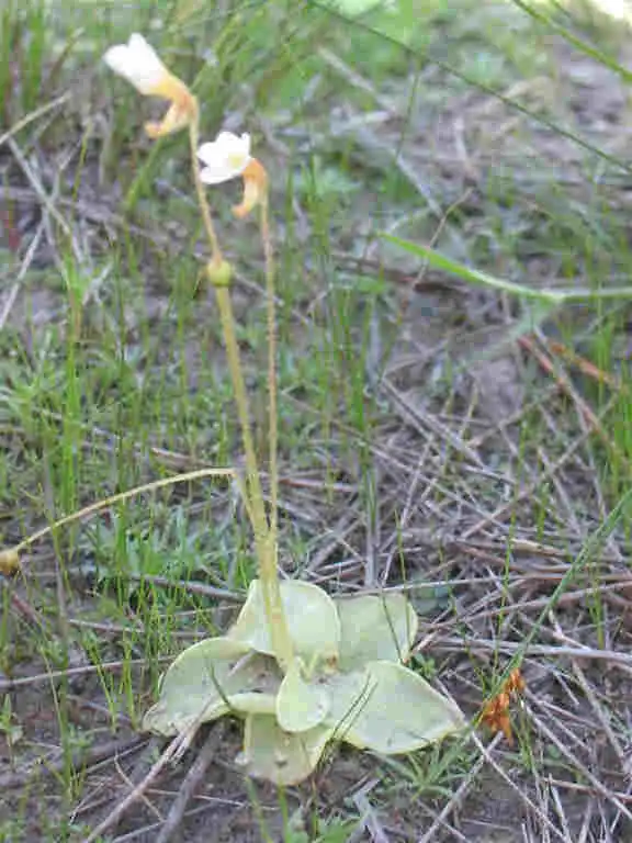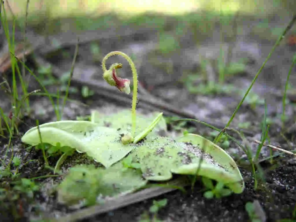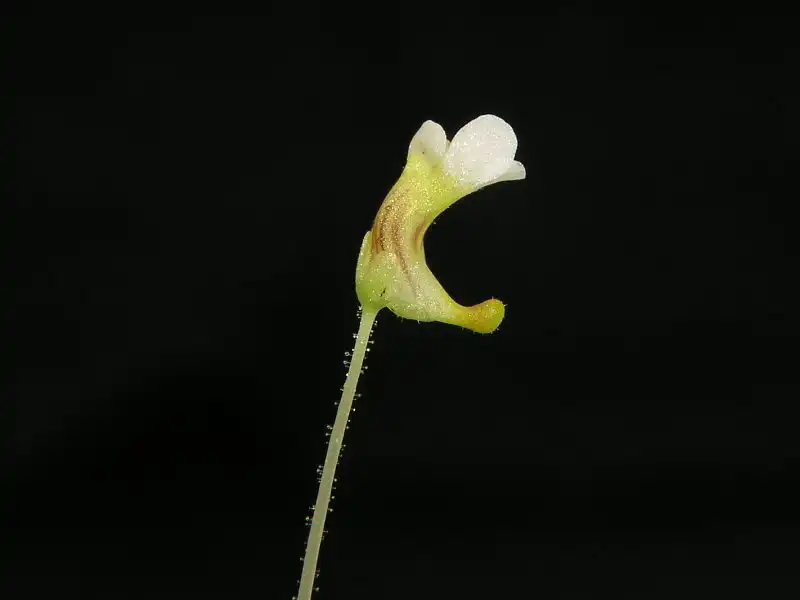 Perennis. Rhizoma simplex breve radicibus adventitiis filiformibus numerosis. Folia (4) 6 - 9 (12) radicalia rosulata integerrima luteo-viridia membranacea obovata rotundata basi valde attenuata margine vix involuta superne glandulis sessilibus dense et glandulis stipitatis disperse vestita basin versus pilis subulatis longis (10) 18 - 35 (45) mm longa (5) 11 - 25 (35) mm lata. Hibernacula nulla. Pedicelli 1 - 4 erecti glandulis stipitatis singularibus obtecti 50 - 150 (200) mm longi uniflori. Flores mediocres 7 - 10 (15) mm longi (calcari incluso). Calyx bilabiatus extus glandulis stipitatis singularibus obtectus; labium superum usque ad basin fere trilobum lobis spathulato-oblongis obtusis; labium inferum usque ad 1/2 1/3 longitudinis bilobum lobis ovato-ovalibus rotundatis. Corolla subisoloba albida vel roseo-albida extus glandulis stipitatis singularibus obsita lobis subaequalibus late obovatis 1/3 - 1/2 longitudinis corollae subaequantibus basi pilis longis clavatis dense vestitis. Tubus late cylindricus basin versus angustatus latere ventrali parum geniculiformiter incurvatus 3 - 4 mm latus sine palato intus pilosu pilis clavatis globose capitatis. Calcar conicum apice rotundatum cum tubo angulum obliquum subdistincte formans 2 - 3 mm longum +/- 1 mm latum. Stamina +/- 1.5 mm longa; pollen 4 - 5 colporatum. Ovarium subglobosum +/- 1 mm diametro glandulis stipitatis singularibus obtectum. Stigma bilabiatum; labium inferum flabelliforme. Capsula subglobosa +/- 2 mm diametro. Semina scobiformia conica +/- 0.5 mm longa +/- 0.2 mm lata reticulata.