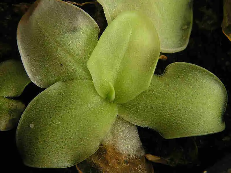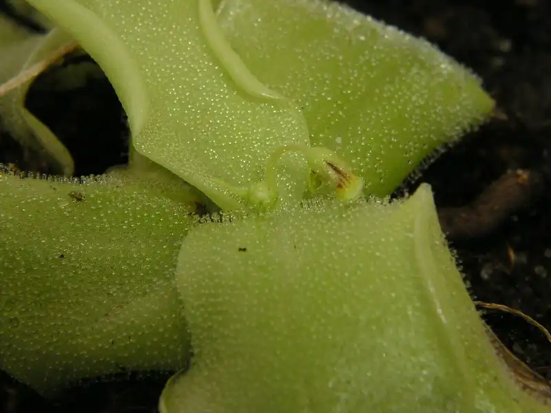 Close up of Pinguicula albida showing glands and a prey. Leaves are so thin that dew can be seen on the under part of the leaves. Photo : Yoannis Dominguez Rodriguez |