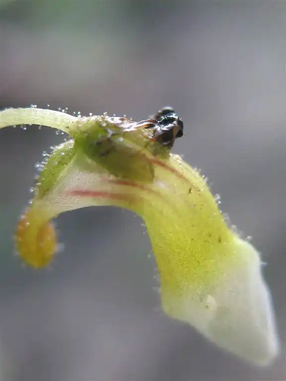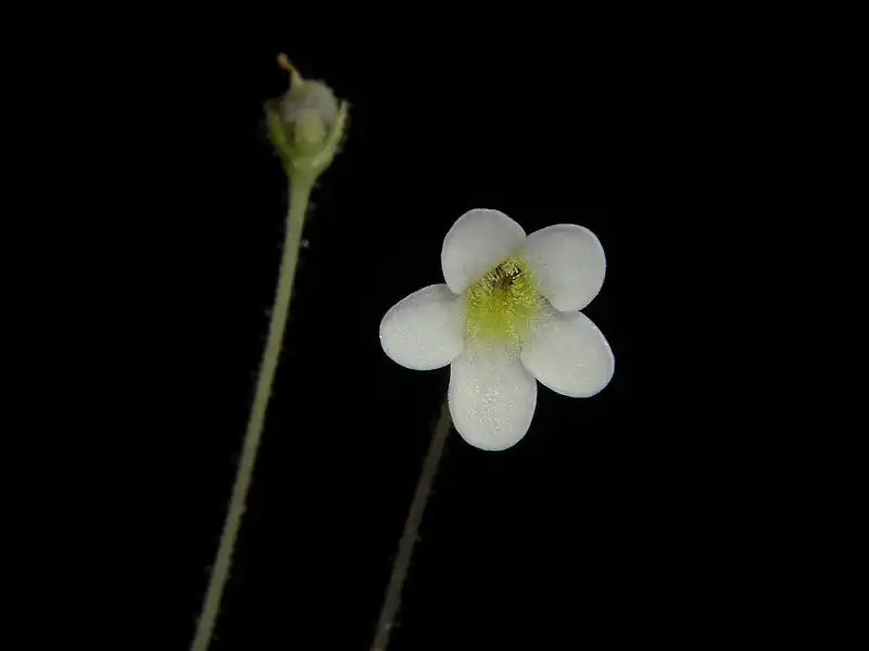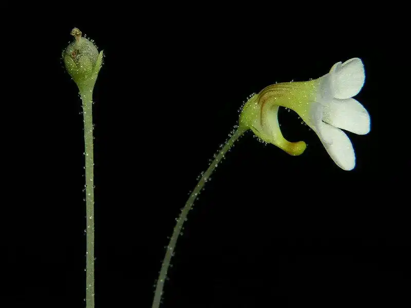 Pinguicula albida catching prey also with its glandular glands on the flower. Photo : Yoannis Dominguez Rodriguez |