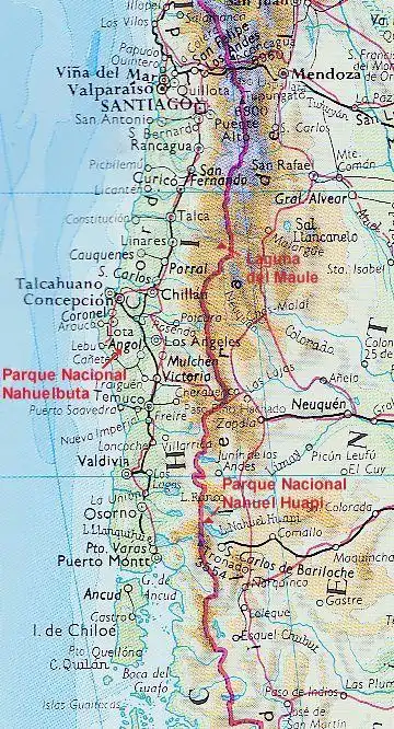 P. antarctica from the southern point of the “Tierra del Fuego” up to the 42° of latitude south. The area of P. chilensis begins where the area of P. antarctica ends at noth. It goes from the National park of Nahuel Huapi at the frontier between Argentina and Chili, to the north of the Laguna del Maule (36° latitude south).