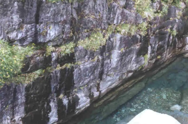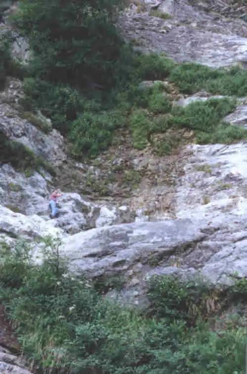 The cascade of " the wedding veil" with Stephane climbing to see Pinguicula corsica Photo : Stéphane Joly |