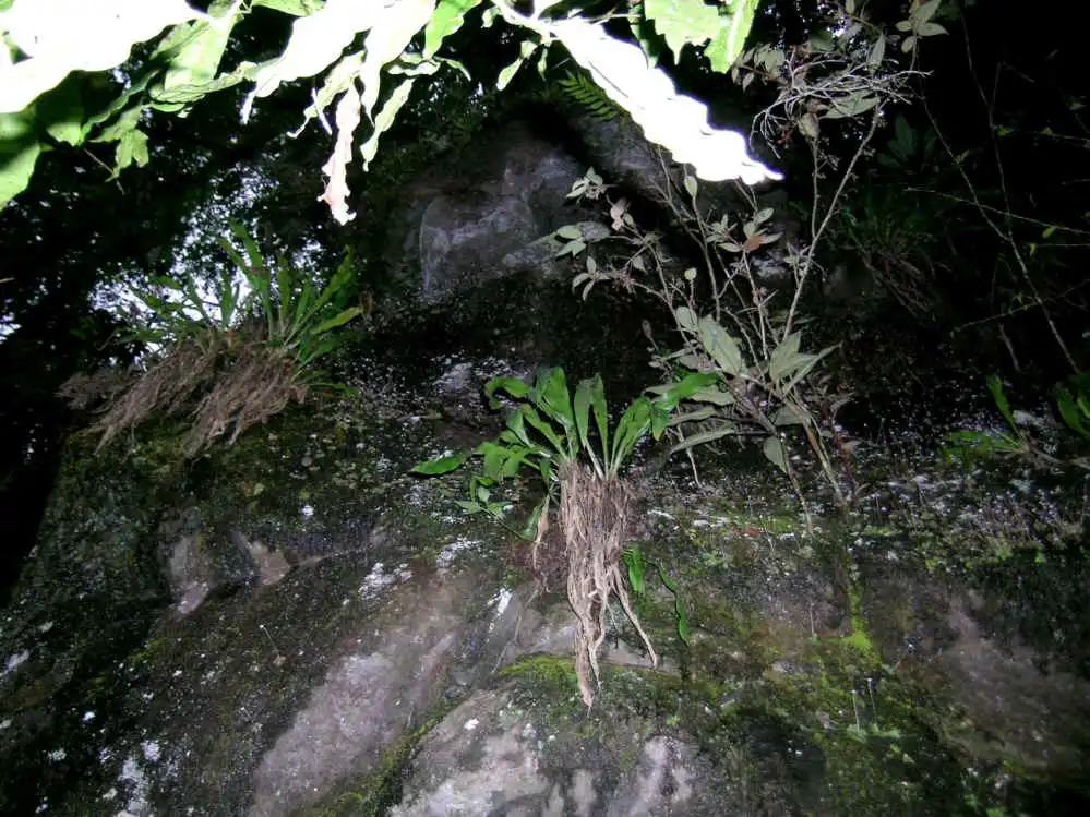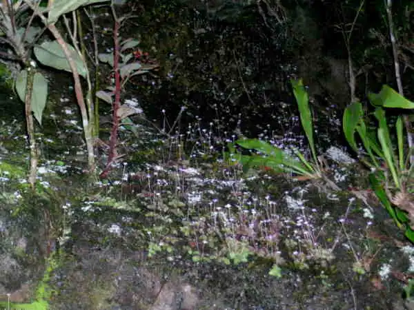 “The vegetation of this area is typically sub-tropical, trees clothed with epiphytes such as bromeliads and orchids and the presence of many tree ferns providing evidence of the high humidity, especially close to the streams. Suddenly, we came upon a huge, vertical sandstone wall facing North and therefore shaded from direct sun. It was consequently more or less bare of any vegetation except for large, compact colonies of P. emarginata !“…“It was very impressive to see thousands of flowers hovering before the mass of leaves of so many hundreds of plants, which were clinging tenaciously by wiry roots to the thin, wet layer of humus coating the rock face”.