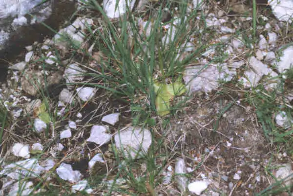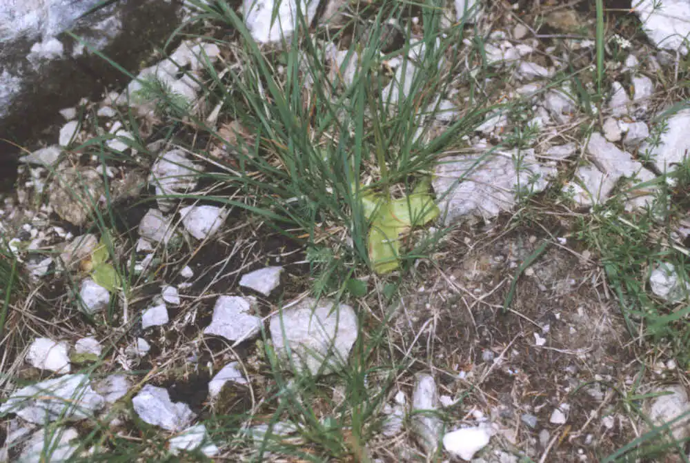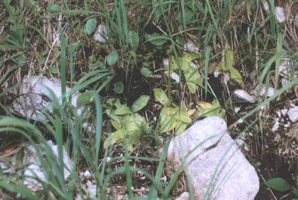 Pinguicula grandiflora and f. pallida growing together in calcareous habitat. When there are no flowers, it is possible to distinguish the species and forma : the forma lacks the dark pigmentation of stalk and calyx. Location : Col de La Faucille, Lajoux/Mijoux, Jura, France. Photo : Eric Partrat - August 1997 - |