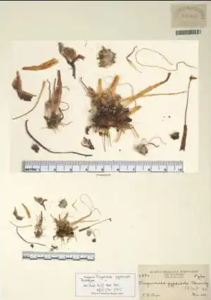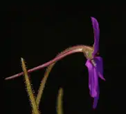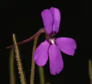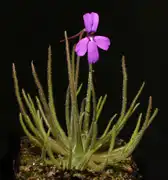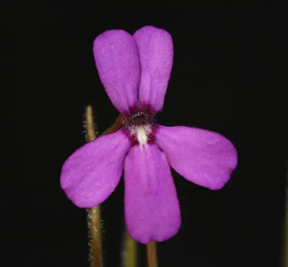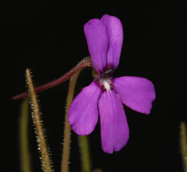 Perennis. Rhizoma simplex breve radicibus adventitiis numerosis filiformibus. Folia numerosa radicalia rosulata biformia; inferiora (rosula densissima “hiemis” ut dicitur) innumerabilia sessilia oblongo-cuneata vel spathula obtusa (4) 7 - 10 (12) mm longa 2 - 3.5mm lata facie plana dorso obtuse carinata margine pilis subulatis ciliata ceterum praeter apicem glanduloso-pilosum; superiora (rosula “aestatis” ut dicitur) 10 - 30 subpetiola erecta lanceolata-linearia medio pilis subulatis ciliata (30) 40 - 70 (130 mm) longa medio 4 - 8mm lata superne glandulis sessilibus et stipitatis dense vestita marginibus parum revolutis pallide viridia; in statu iuvenili apice spiraliter involuto. Hibernacula nulla. Pedicelli (1) 3 -7 (11) erecti filiformes glandulis stipitati obtecti folia multumsuperantes (60) 75 - 125 (170) mm alti uniflori. Flores maximi (30) 34 - 42 (50) mm longi (calcari incluso). Calyx bilabiatus laete viridis extus glandulis stipitatis dense obsitus; labium superum profunde tripartitum lobis late triangulo-ovatis; labium inferum usque ad 13 longitudinis bilobum lobis oblongis. Corolla ringes profunde bilabiata violaceo-purpurea; labium superum bilobum lobis lineari-oblongis subrotundatis; labium inferum trilobum lobis lineari-oblongis subrotundatis vel truncatis longioribus quam latis 6 -10mm longis 3 - 5mm latis inter se non tegentibus. Tubus brevissimus infundibuliformis 3 - 4mm longus sine palato intus albid-opilosus pilis clavatis irregulariter ordinatis. Calcar gracile cylindricum horizontaliter patens vel subdescendens purpurascens intus pilosum pilis subulatis (18) 20 -26 (31) mm longum tubum limbumque corollae superans. Pollen (5) 6 - (7) - colporatum. Ovarium subglobosum glandulis stipitatis nonnullis obsitum. Stigma bilabiatum violaceum labio infero maximo suborbiculato. Capsula ignota. Semina ignota.