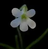 The flower of Pinguicula heterophylla. The corolla is whitish, with a yellow-greenish blot on the throat. Photo : Eric Partrat May 2002 -