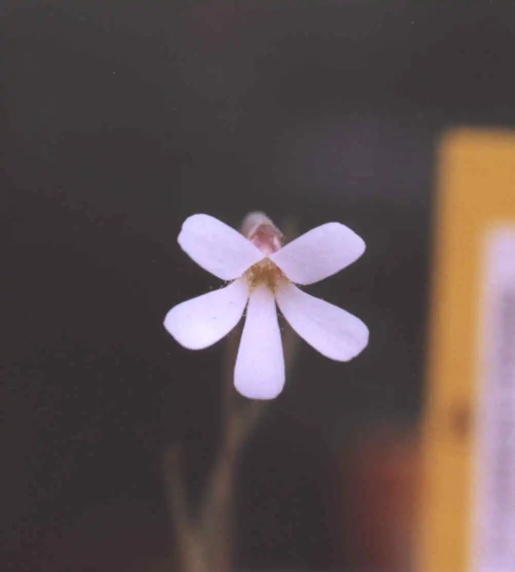 The flower of Pinguicula heterophylla. The corolla is whitish, with a yellow-greenish blot on the throat. Photo : Eric Partrat May 2002 -