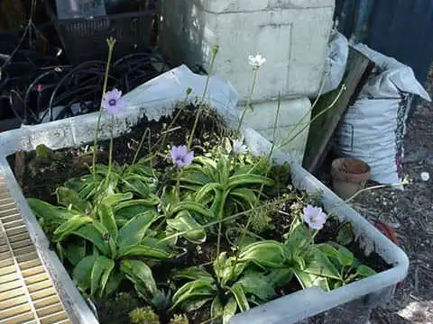 Pinguicula ionantha flowering. Note the different petal colors. Plants are approximative 6inches across. Plants grown in Bob's garden in wet peat/sphagnum in semi shade. Photo : Bob McMorris |