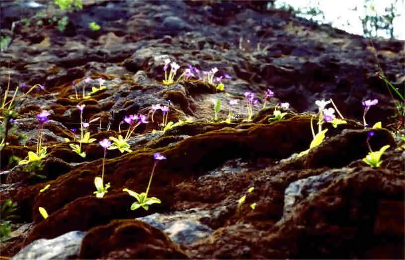 Pinguicula longifolia subsp. caussensis is an endemic to a small area in France called Les Causses. Jurg Steiger in “Pinguicula (Lentibulariaceae) : The cool climate species of the northern hemisphere - Morphology, Biology, Cultivation” a text from the second conference of the International Carnivorous Plants Society, Bonn (Germany), May 30 - June 1st, 1998, wrote that compared to the plants of the Pyrenees, this subspecieshas considerably smaller flowers with less overlapping corolla lobes. Althought growing in much milder climate its summer leaves are by far not far as long as those of the plants from The Pyrenees and it does not present glands on the underside of the leaves.