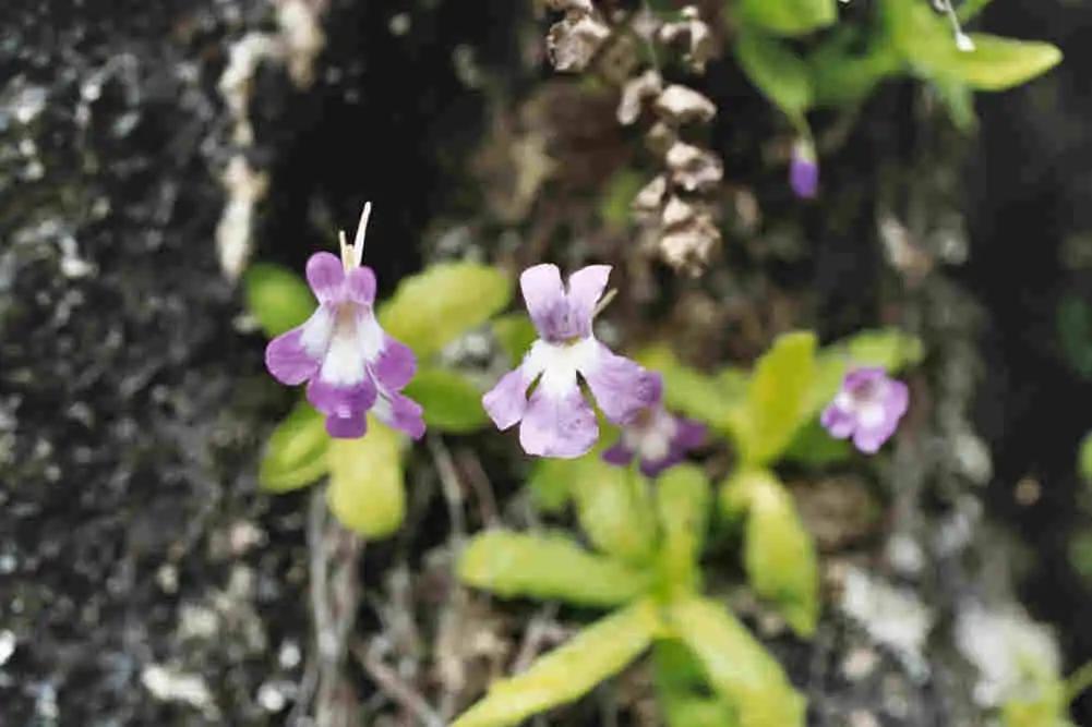 Pinguicula longifolia in full bloom. The younger flower are darker than the older ones.