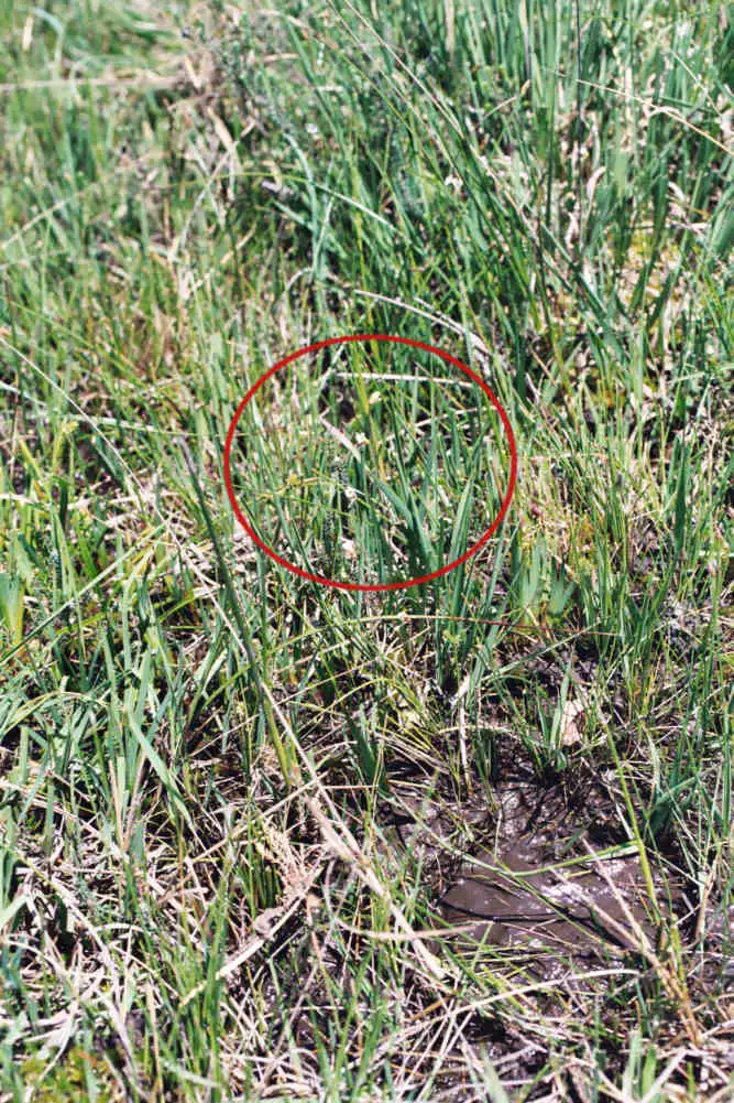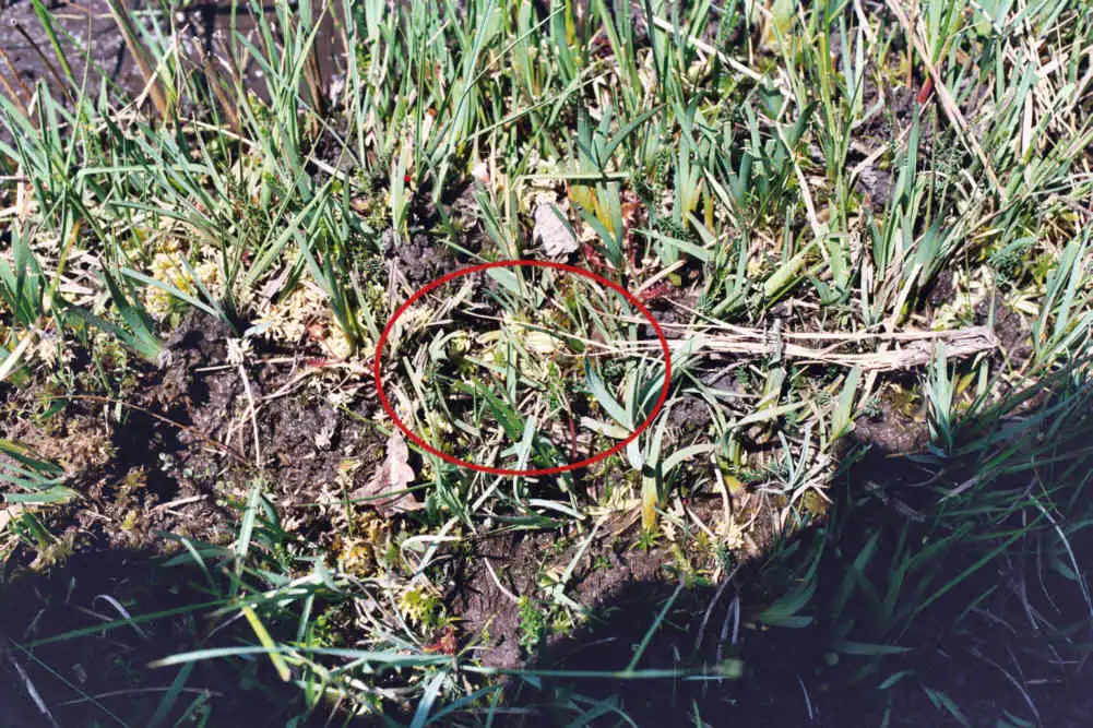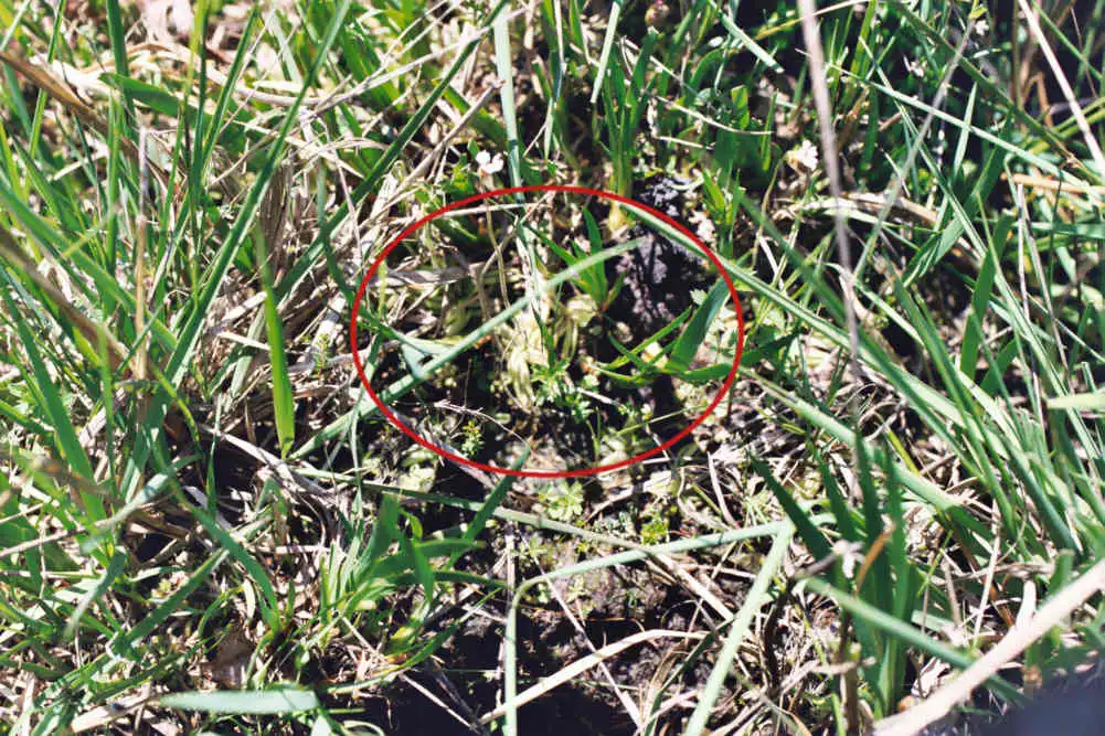 Here is Pinguicula lusitanica hidden in the grasses. With a little experience, you will focuse first on the very small white flowers then search for the hidden rosette. Photo : Eric Partrat - May/June 2003 - |