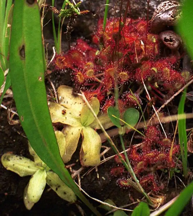 Drosera rotundifolia together with P. macroceras subsp. nortensis (in the upper right corner you will find some dead Darlingtonia californica leaves). Photo : Dieter Kadereit |