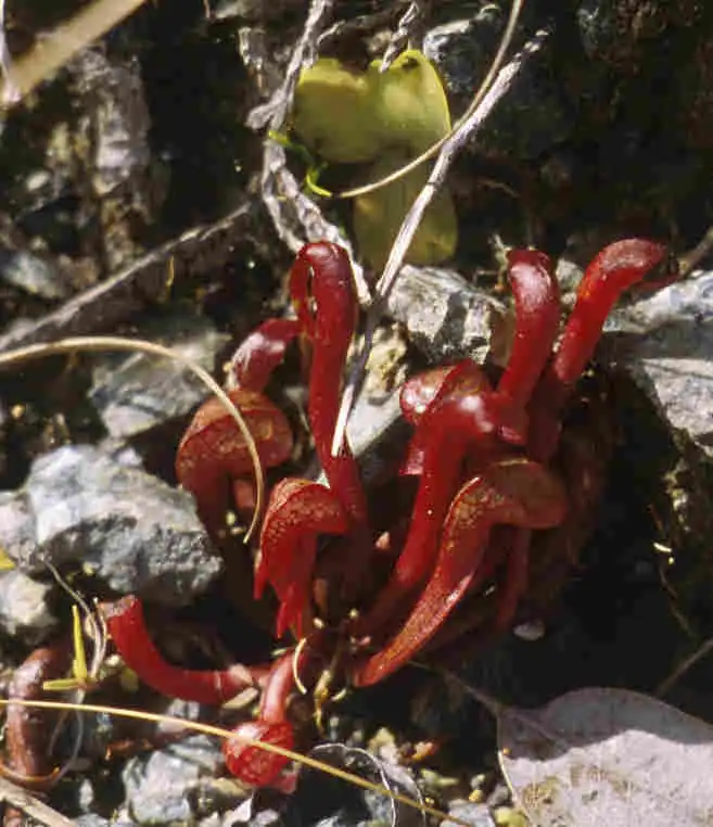 Young Darlingtonia californica and Pinguicula macroceras subsp. nortensis. Photo : Dieter Kadereit |