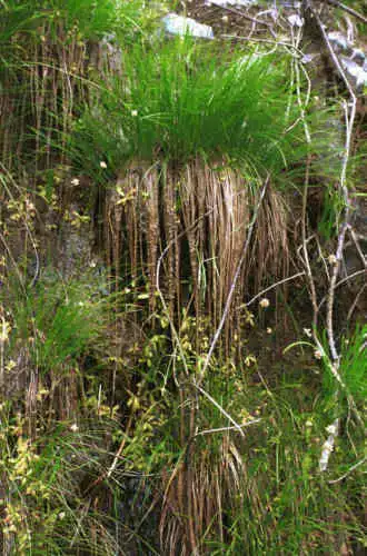 Pinguicula macroceras subsp. nortensis growing on hanging dead grass leaves. Photo : Dieter Kadereit |