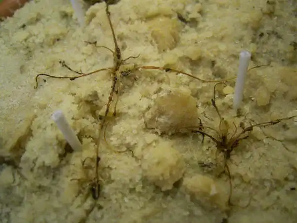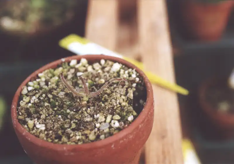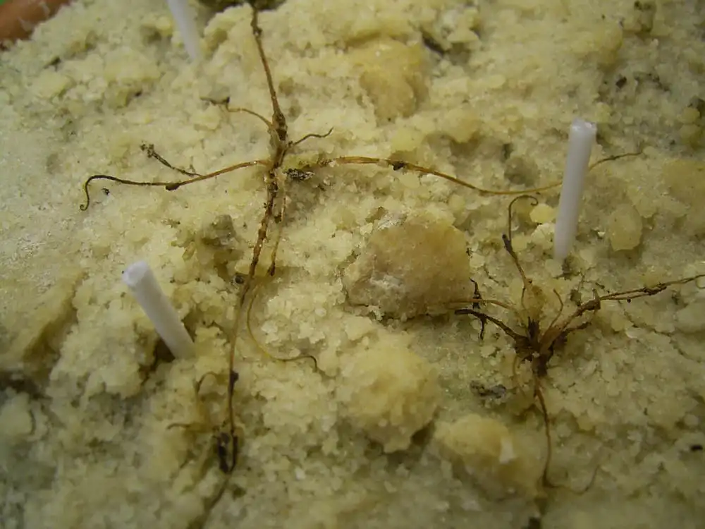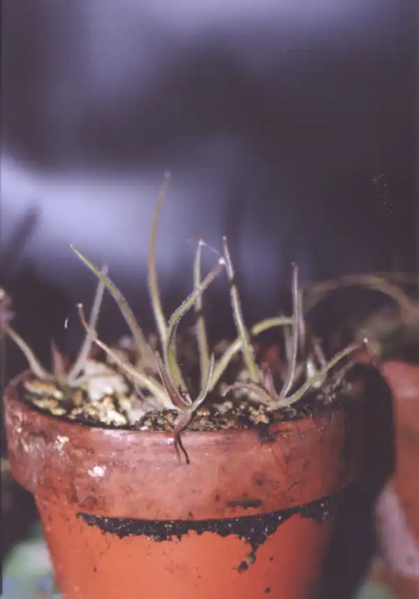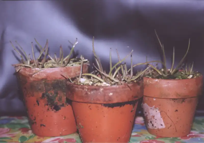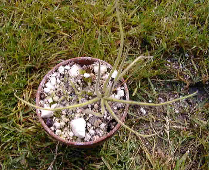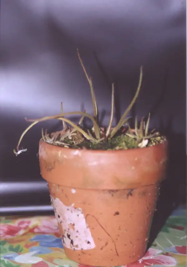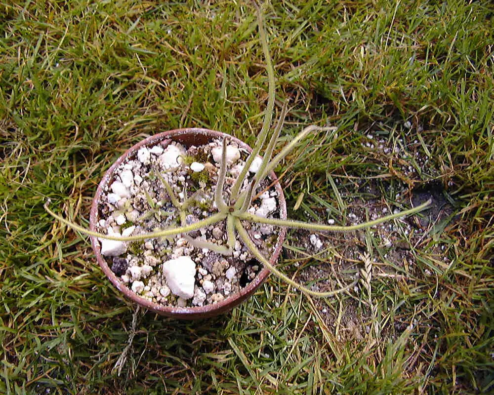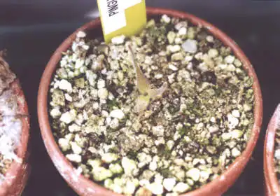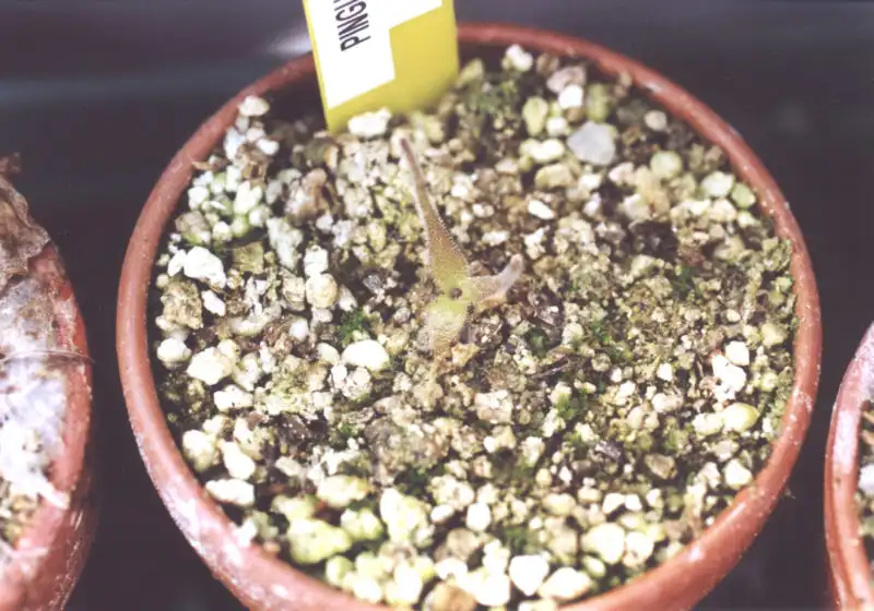 Pinguicula medusina grown in pure gypsum. The winter rosette are deeply buried in the media. Only the old dried summer leaves (and my white tubes) can reveal the resting plants. Photo : E.Partrat March 2005 |